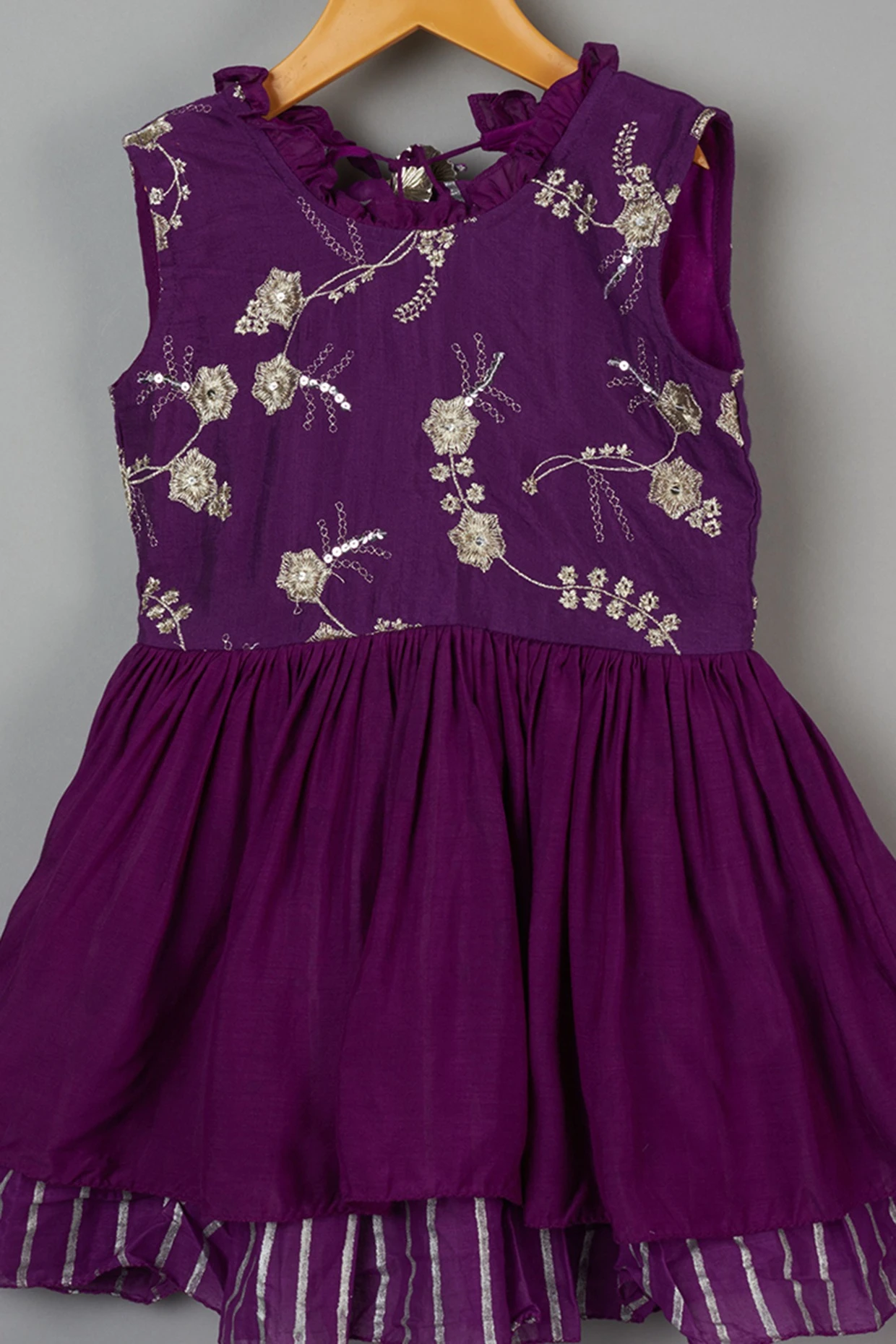 Featuring a purple dress in katan silk and muslin base with embroidery and print.