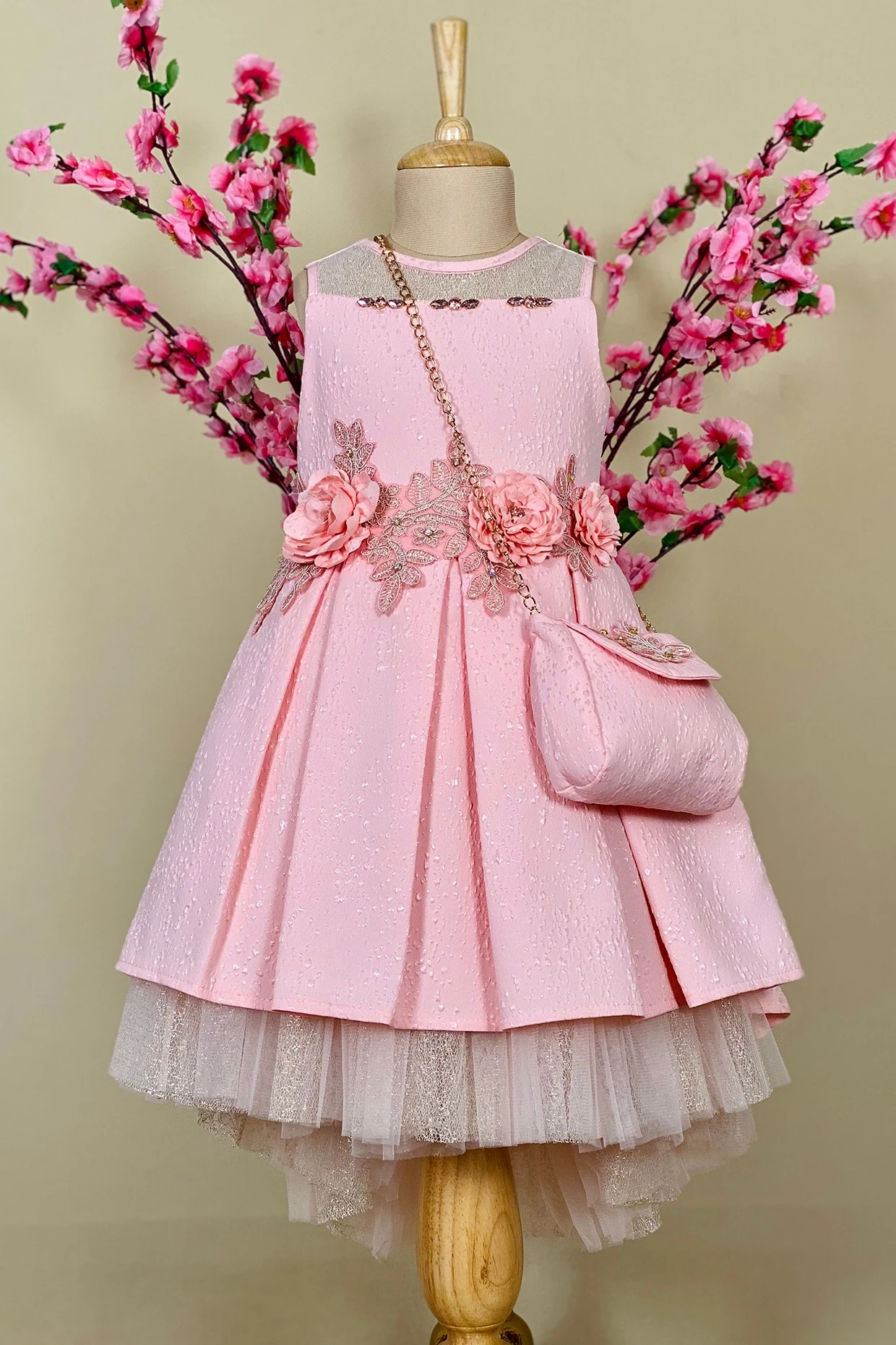 Featuring a blush pink high-low dress in cotton polyester base. It is paired with a matching bag.