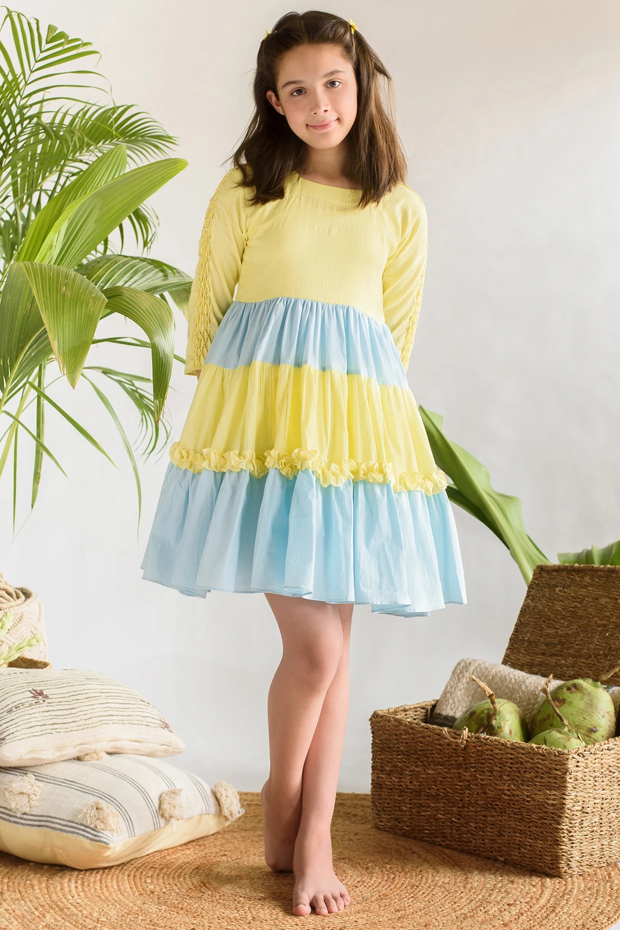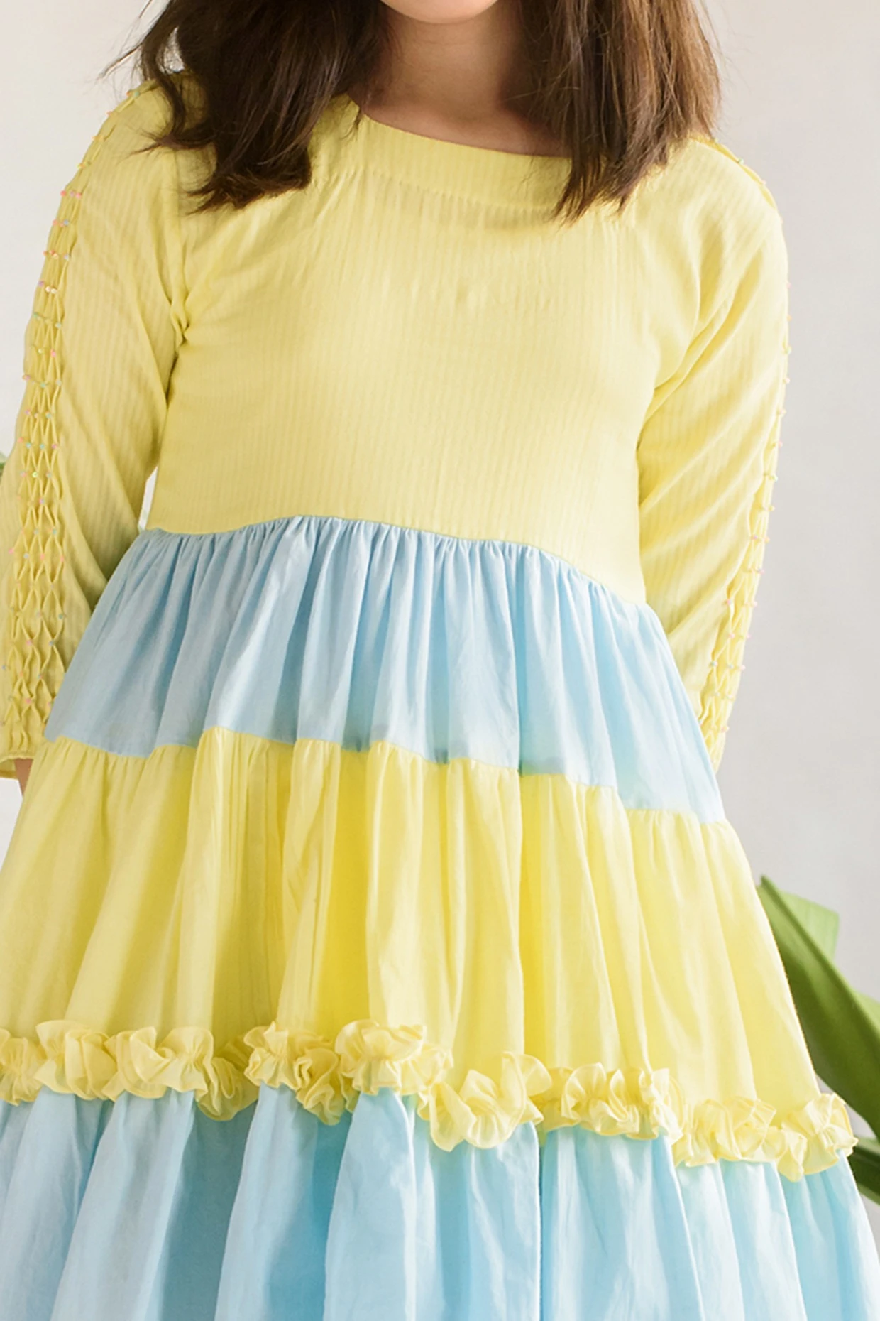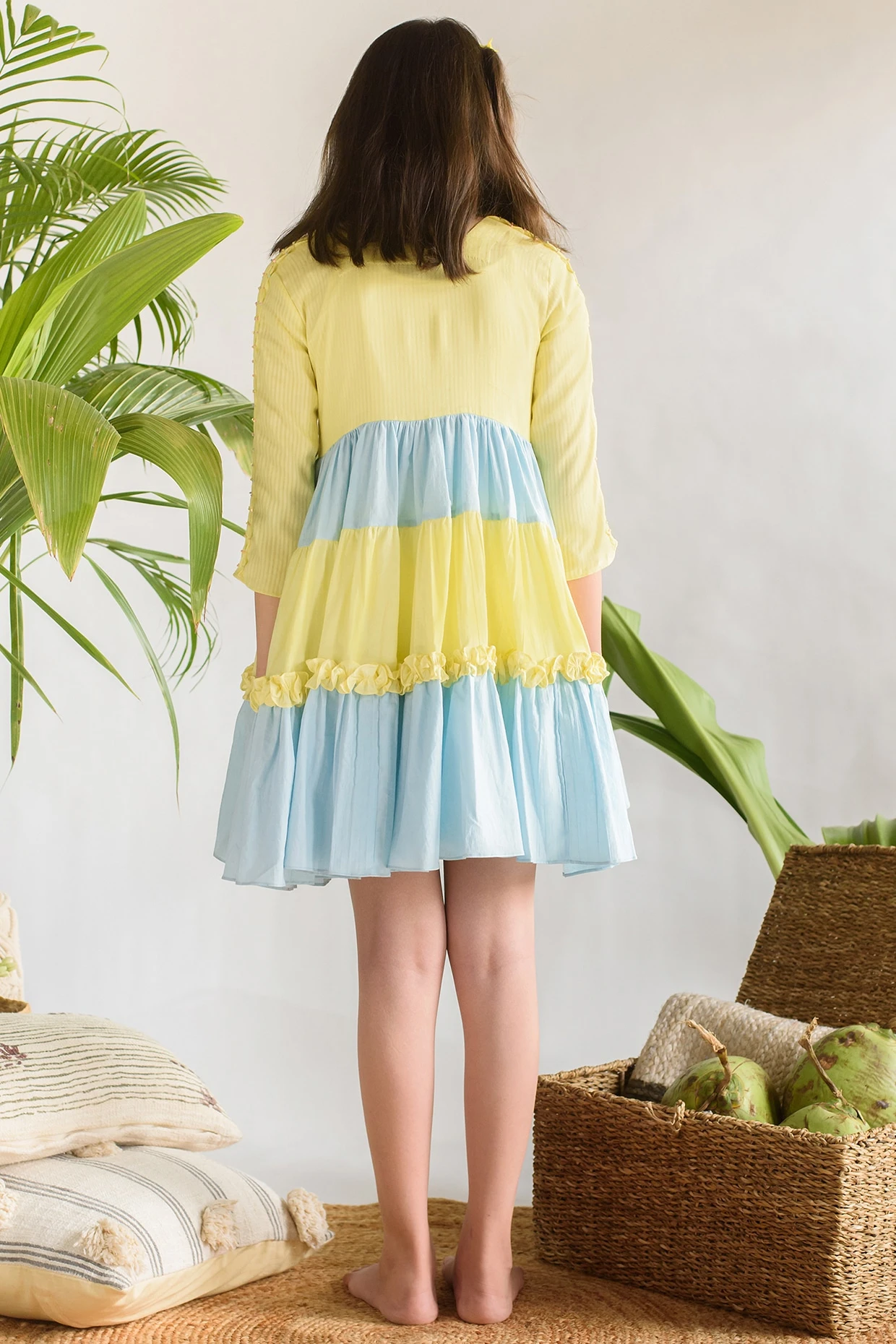 Featuring a yellow and blue dress in handloom stripe organic cotton base with pin-tucked sleeves and sequins mocking.