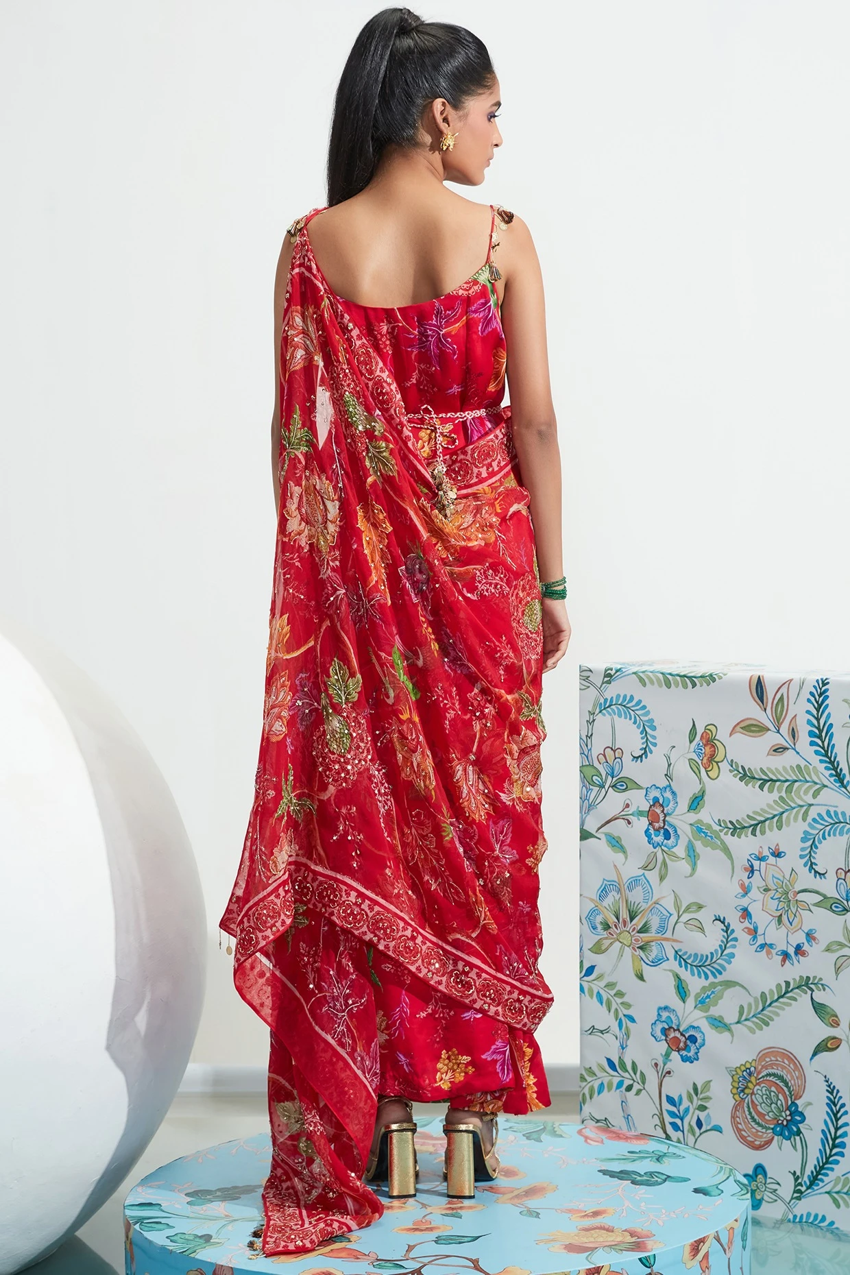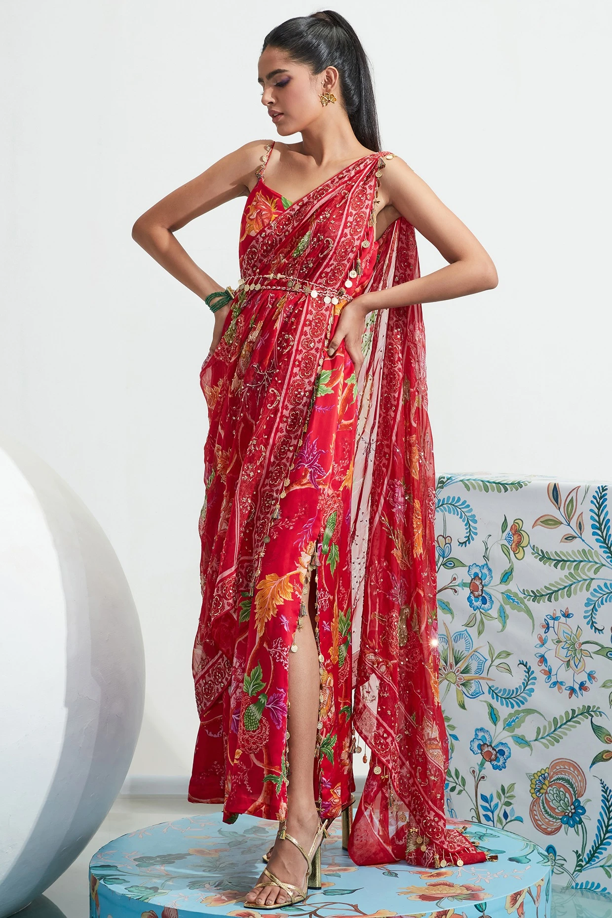 Featuring a red choga dress in satin organza base with embroidery. It is paired with a matching organza embroidered cape and a belt.