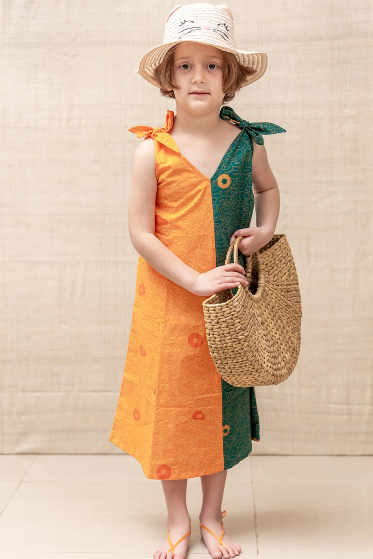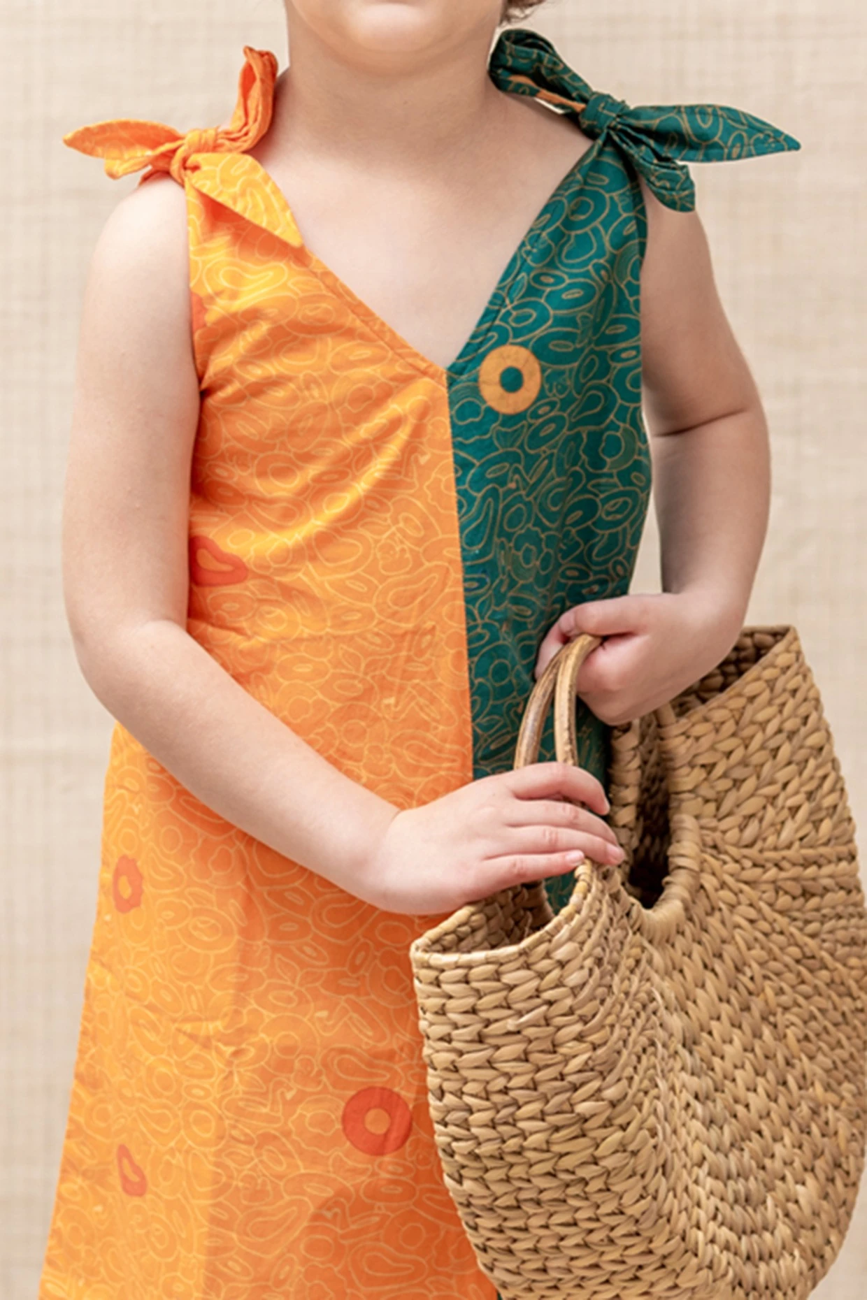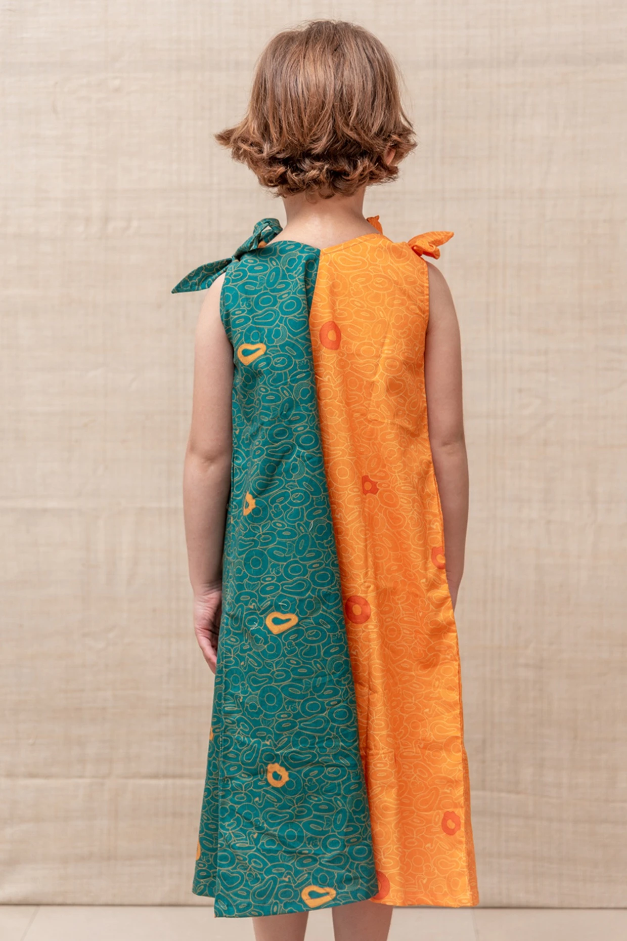Featuring an orange and green maxi dress in organic cotton base with abstract print and tie-ups. This contains only one piece.