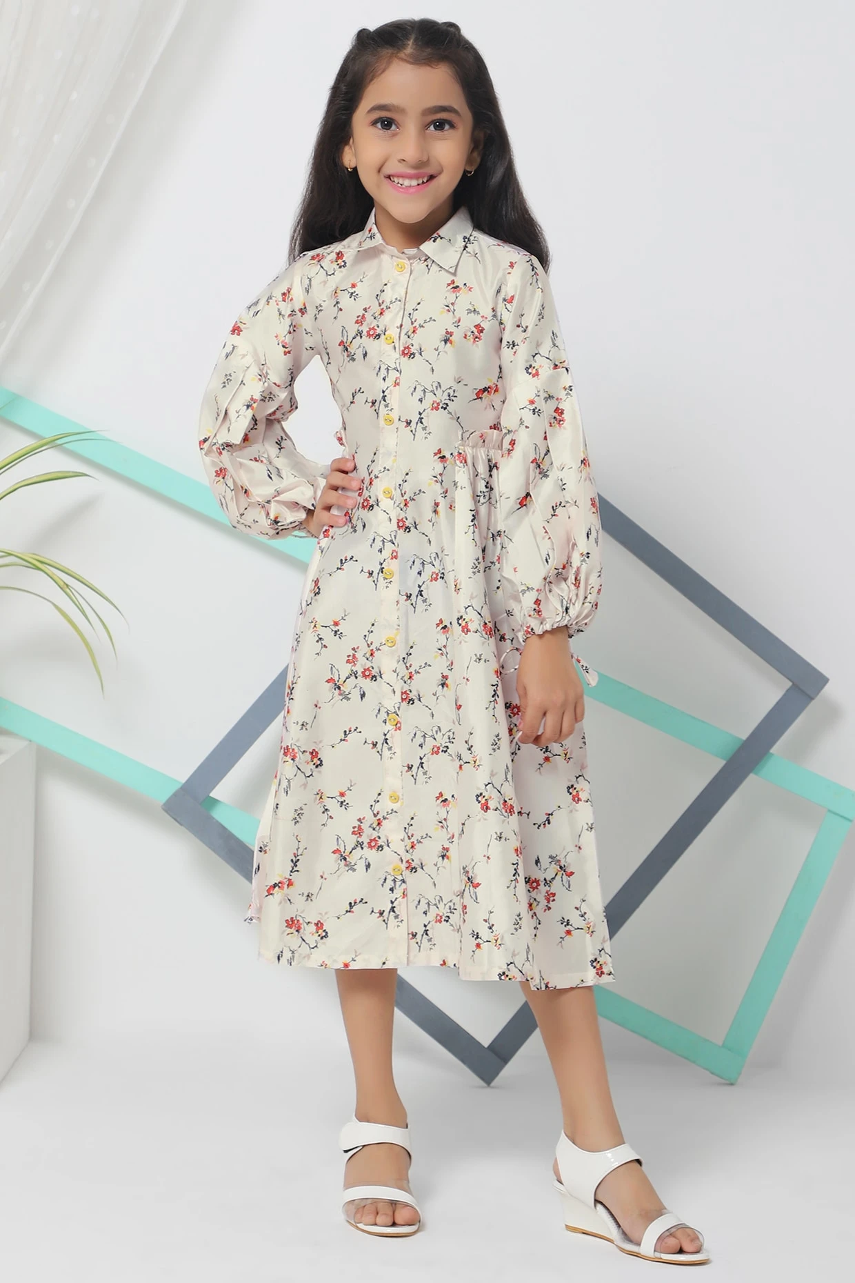 Featuring a cream midi dress in polyester base with high neck collar, baggy sleeves and multi-colored floral print.