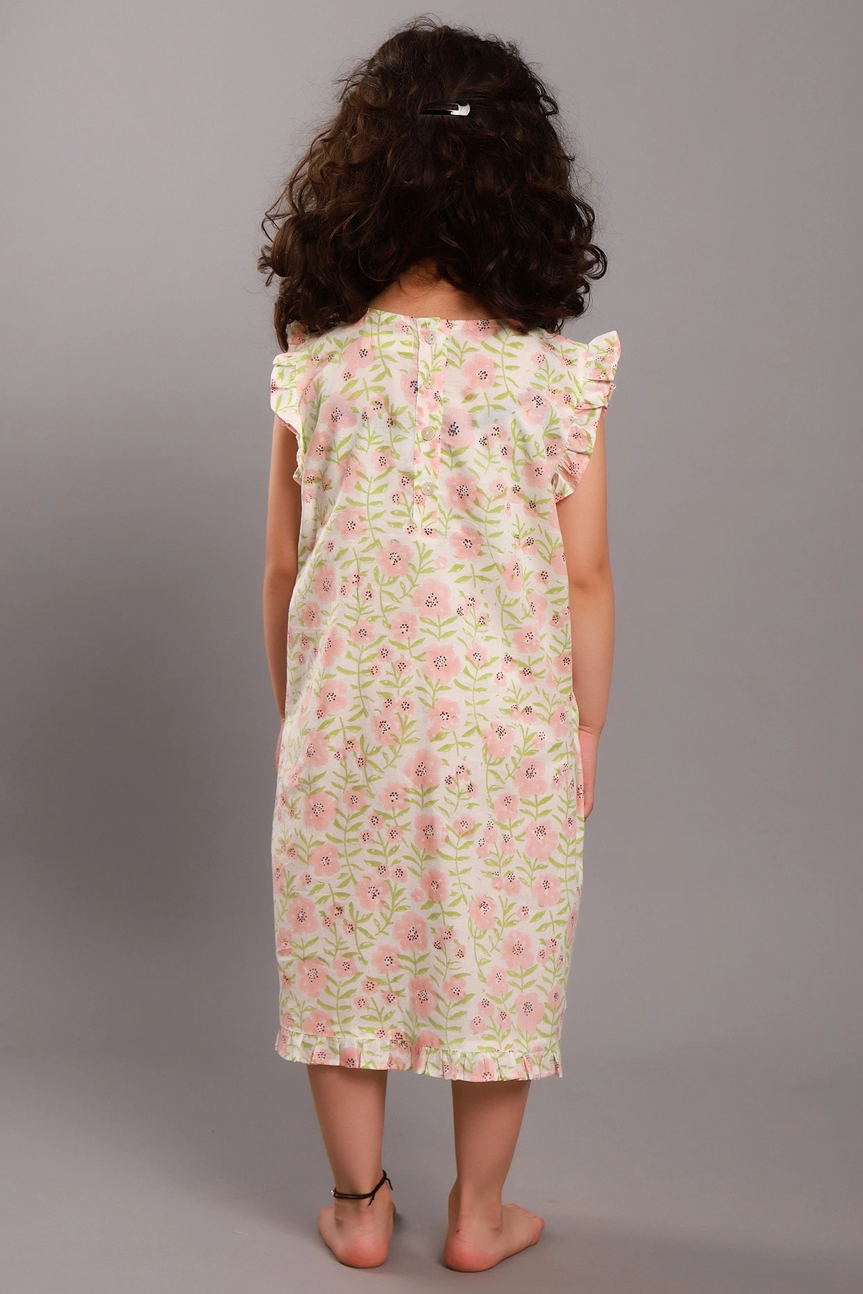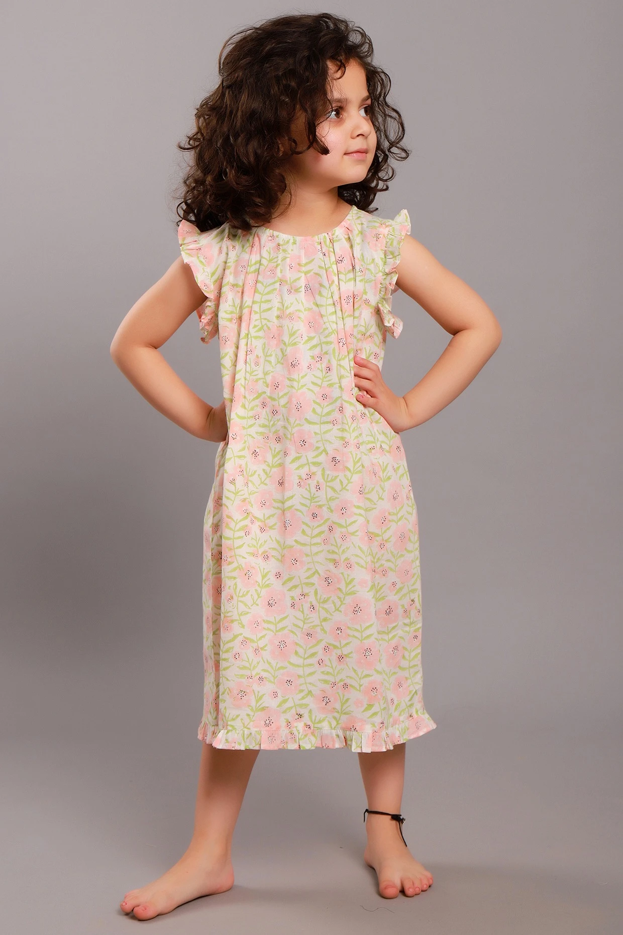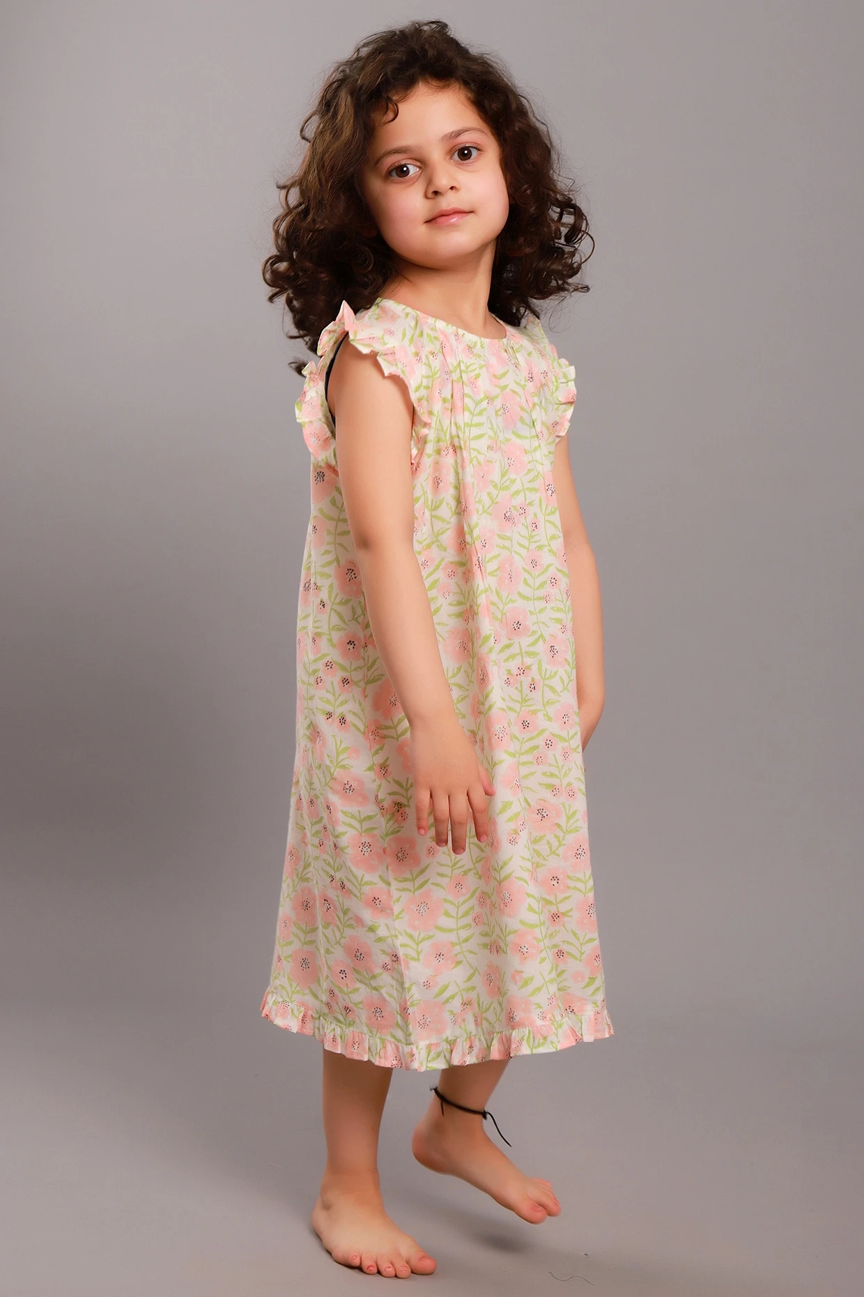 Featuring a pale pink maxi dress in cotton base with floral block print and frills.