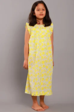Featuring a pale yellow maxi dress in cotton base with floral block print and frills.