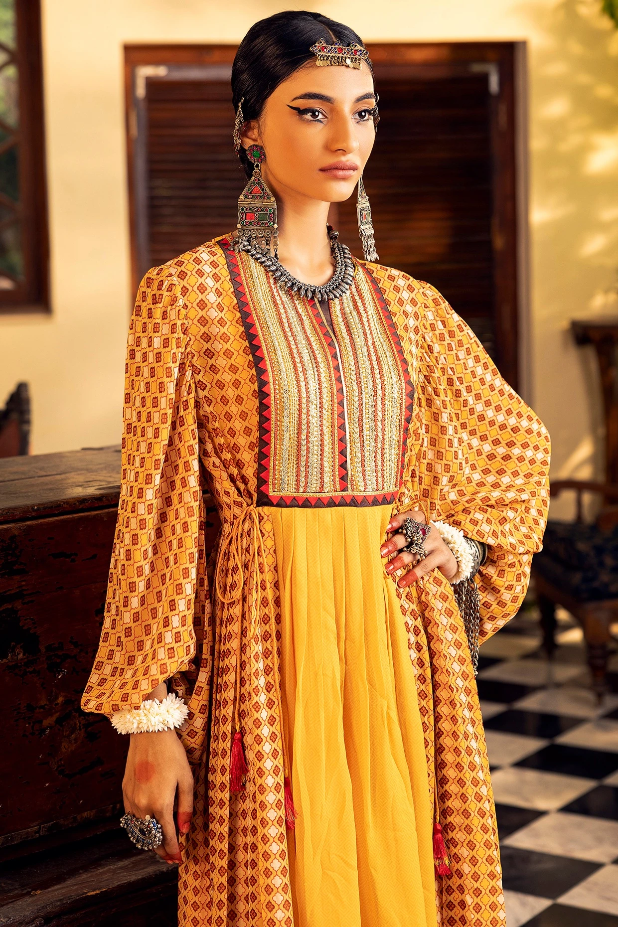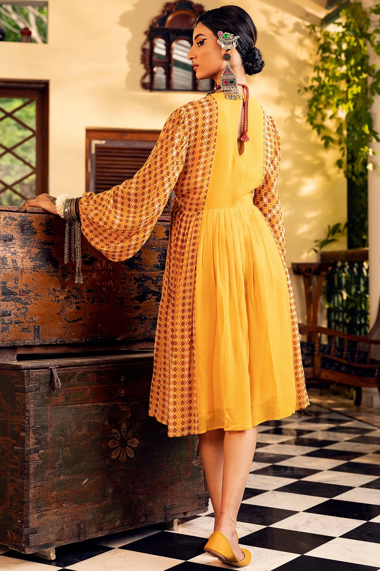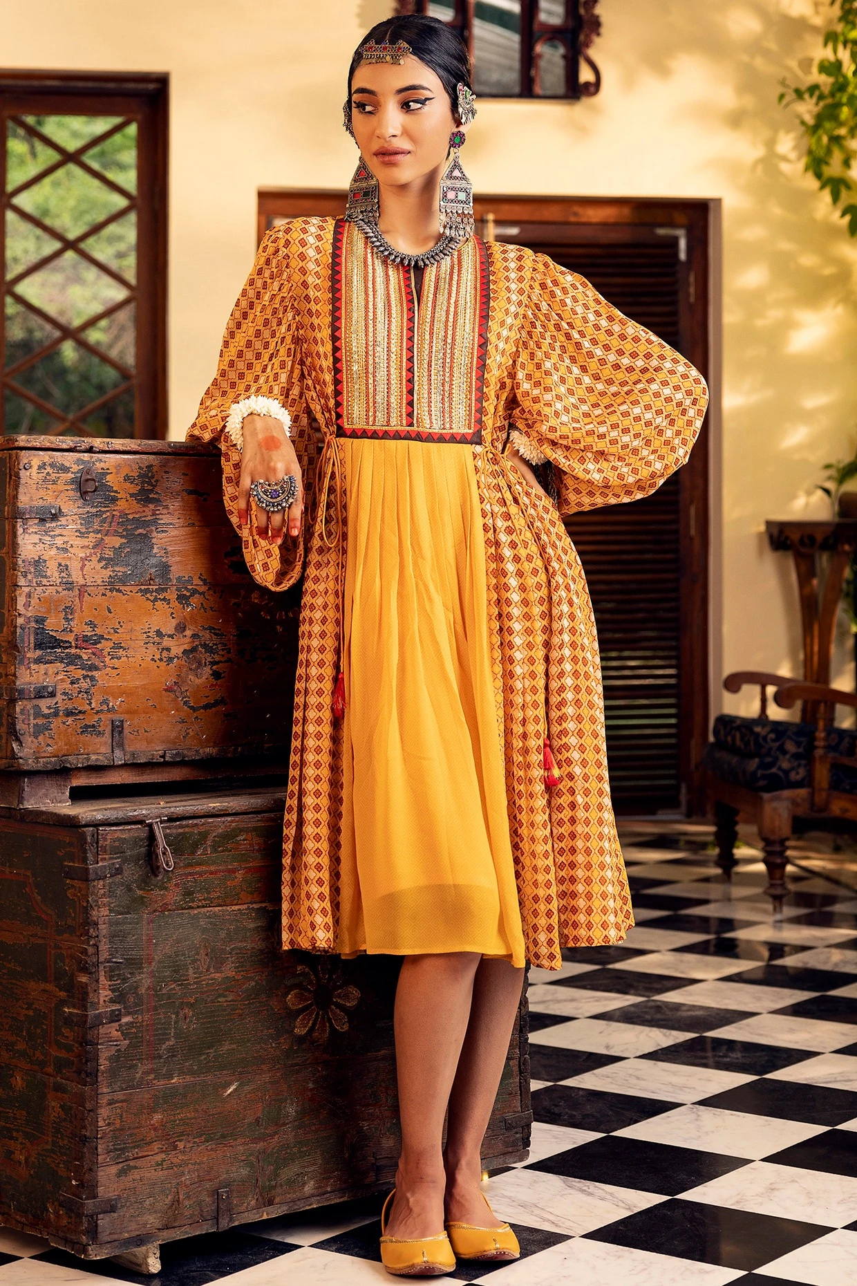 Featuring a yellow dress in georgette base with digital print and embroidery including balloon sleeves.