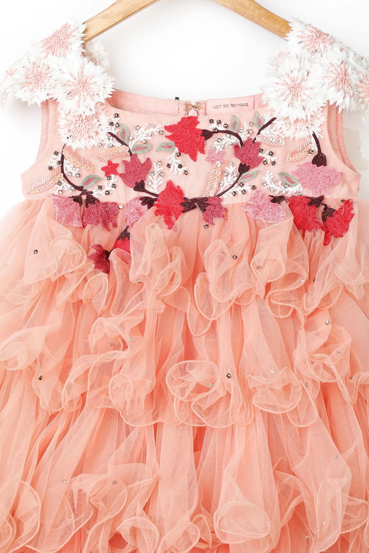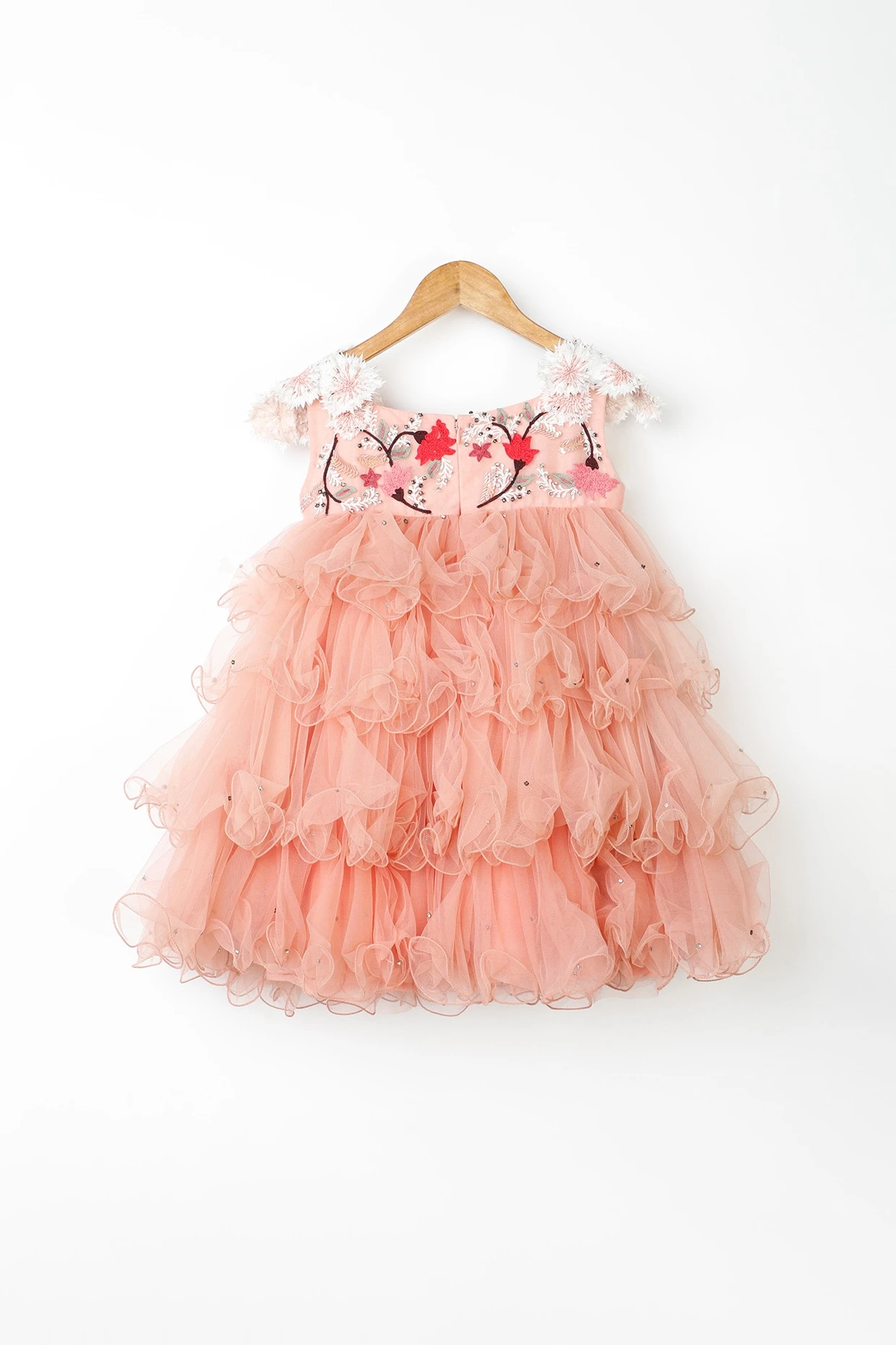 Featuring a peach layered dress in tulle base with applique hand embroidery.