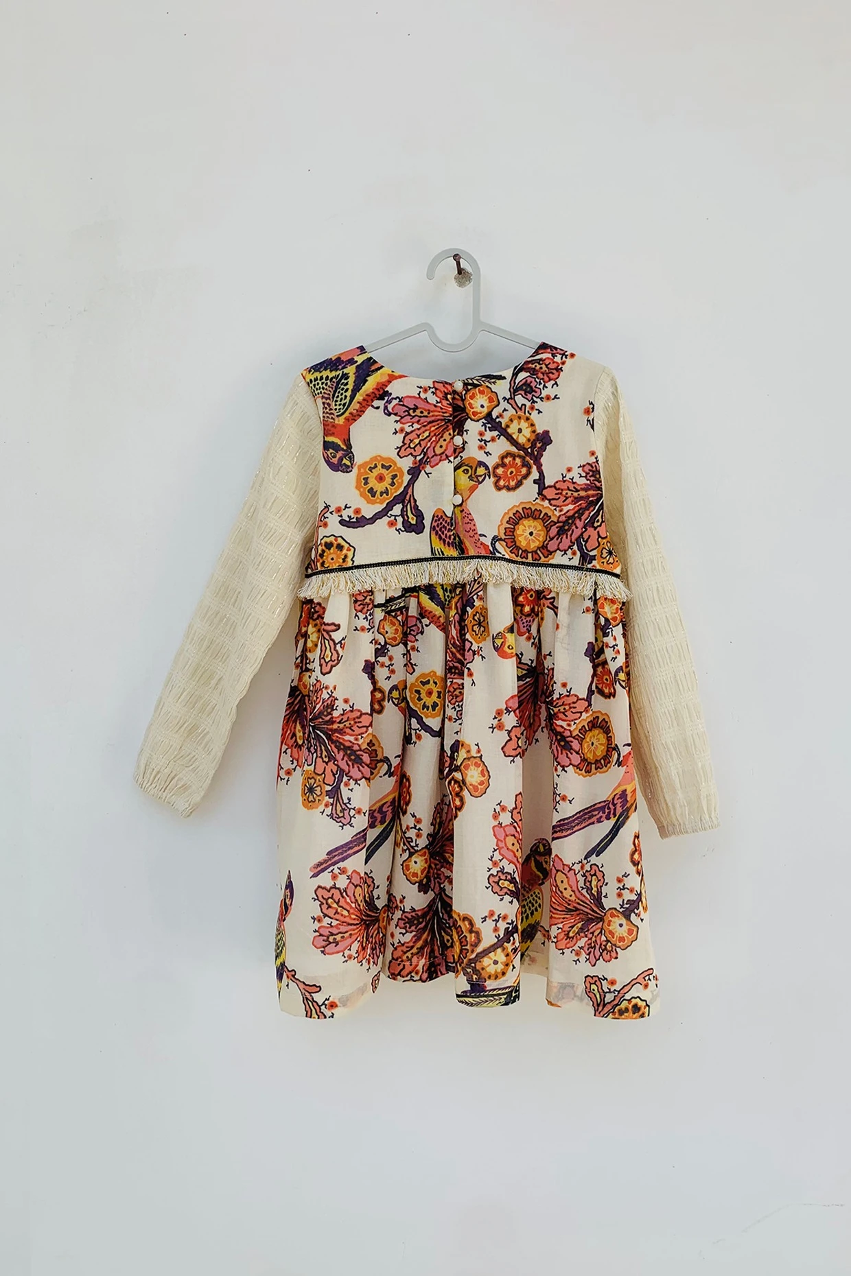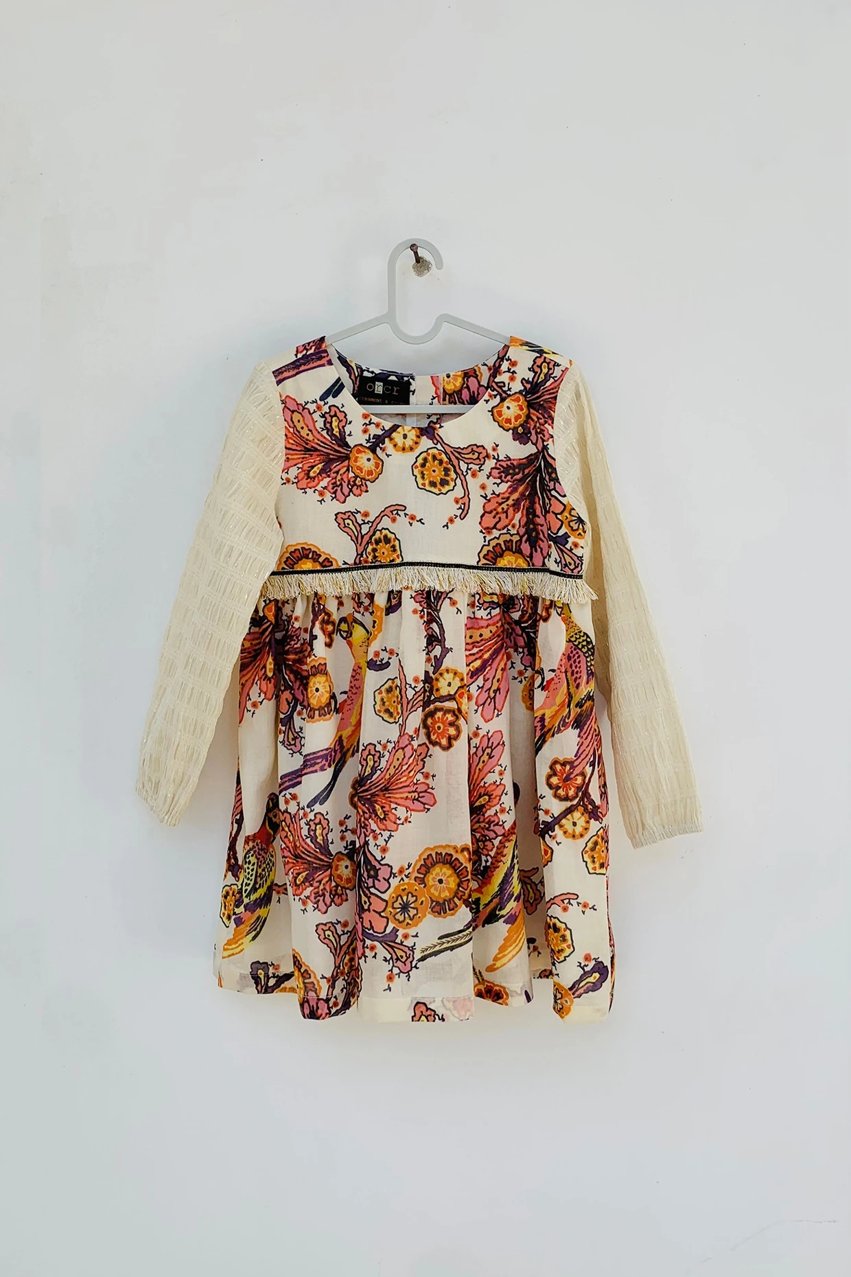 Featuring an off white A-line dress in cotton lycra and cotton base with print and fringe detailing.