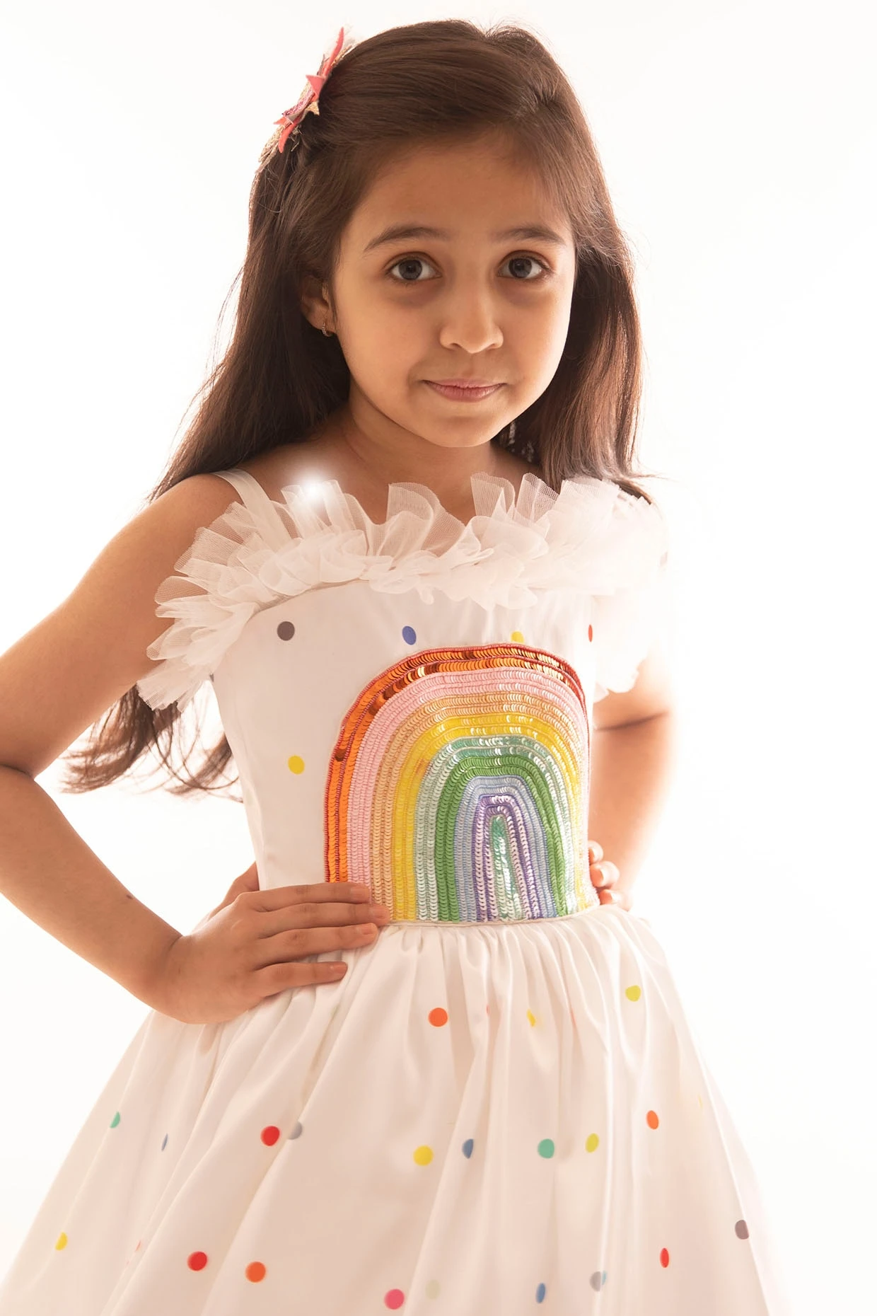 Featuring an off white flared dress in tulle and satin base with frills, printed polkas, and hand embroidery.