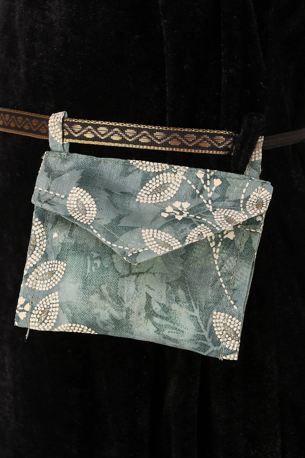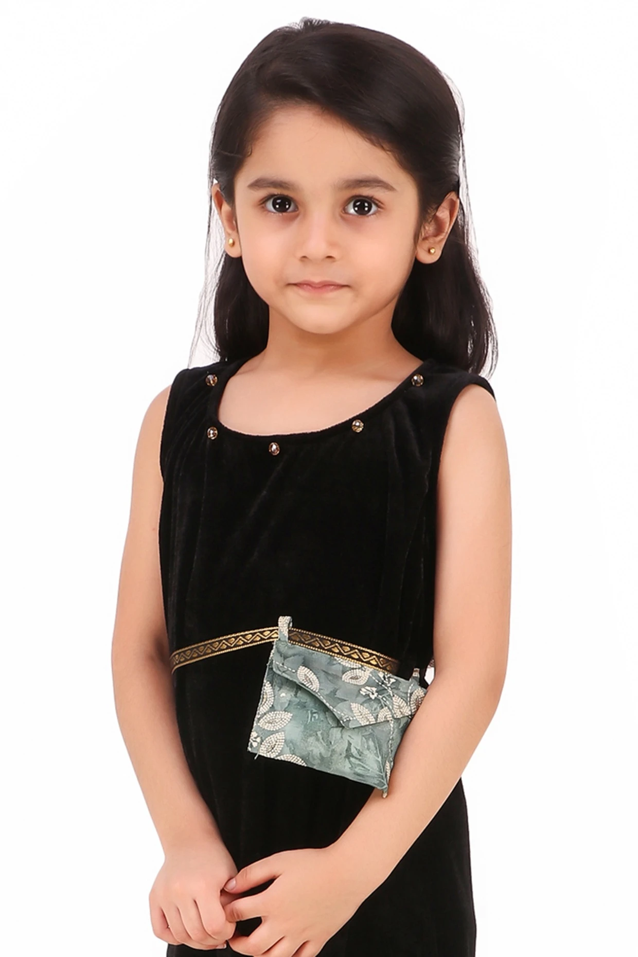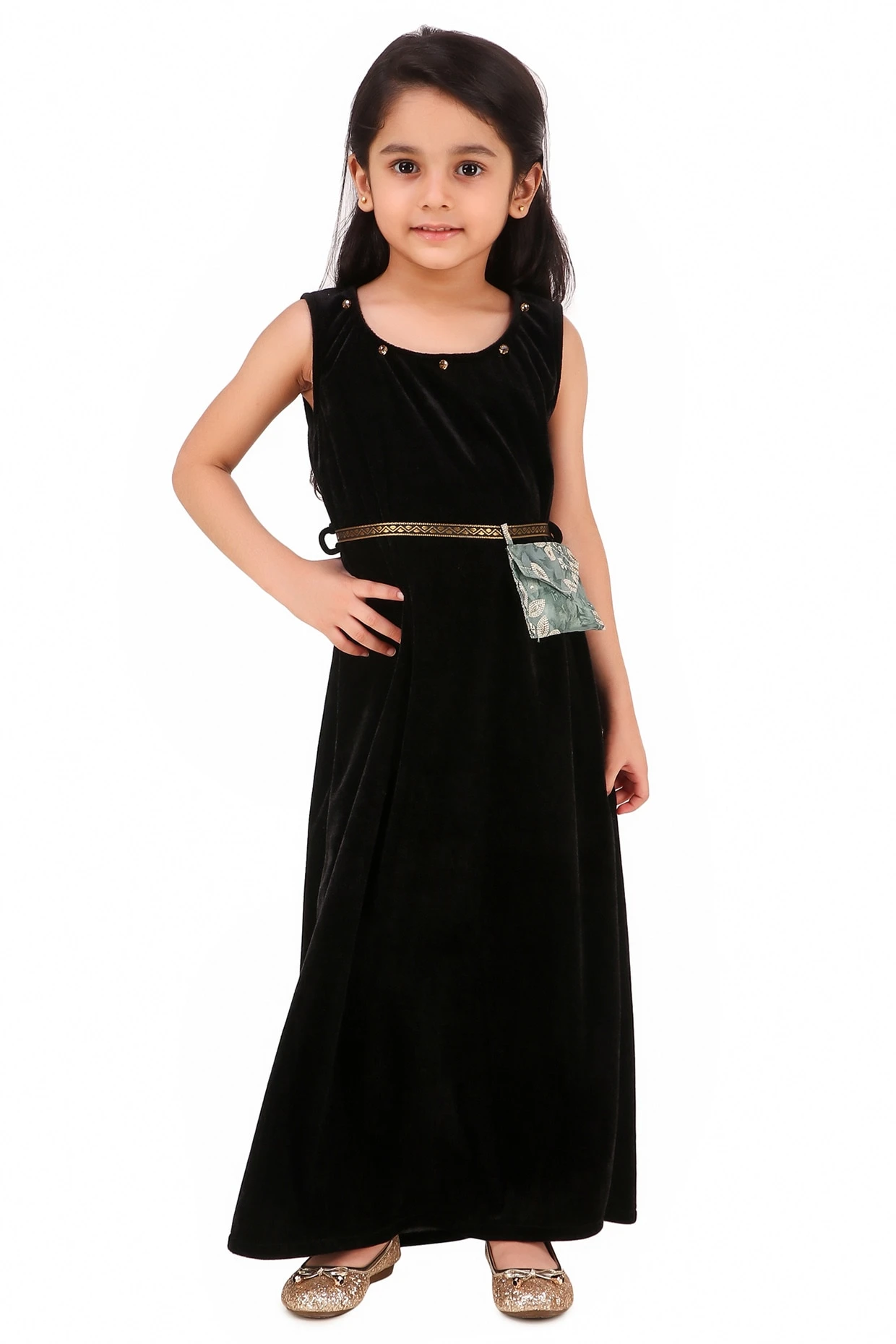 Featuring a black maxi A-line dress in velvet base with gold stone detailings and back zip. It is paired with a contrasting detachable belt having a bag.