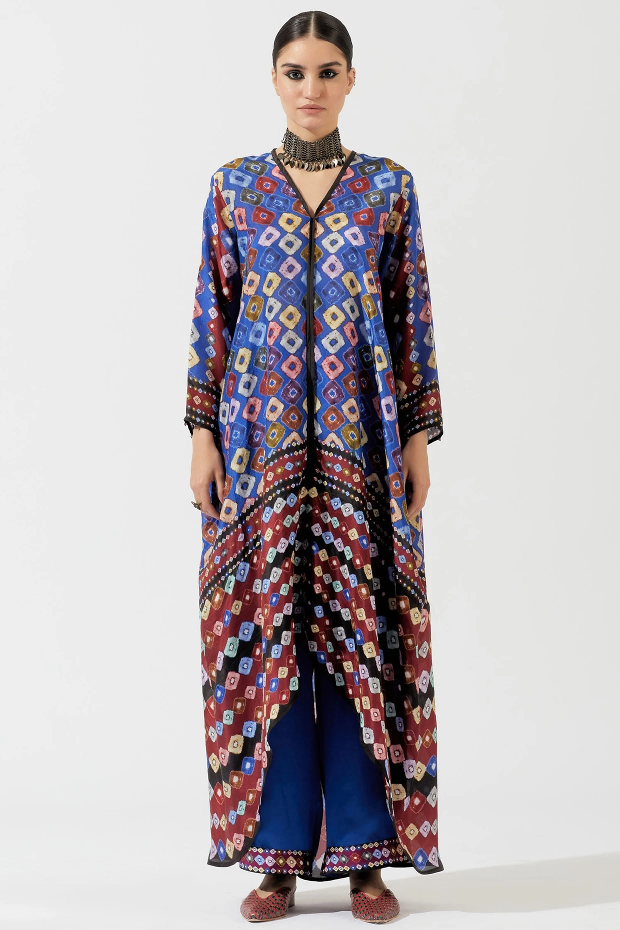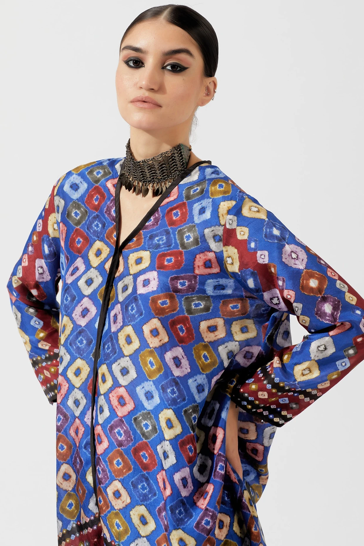 Featuring a cobalt blue draped dress in silk base with print. This contains only one piece.