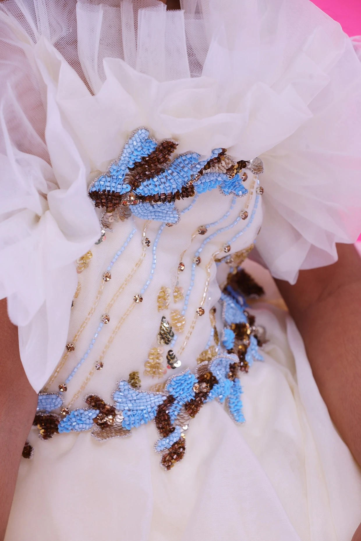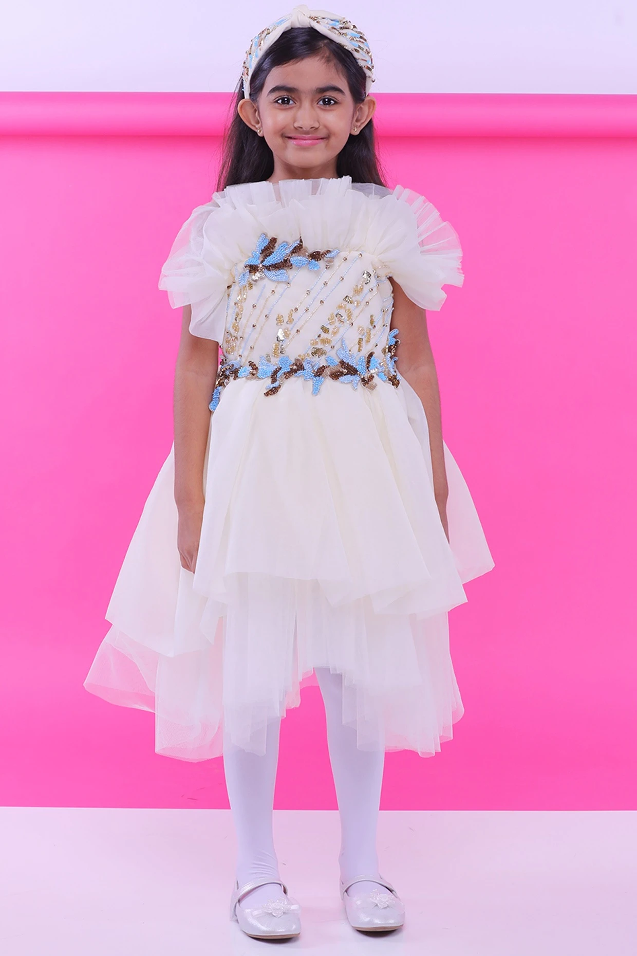Featuring a cream dress in organza and tulle base with embroidery.