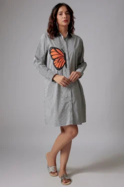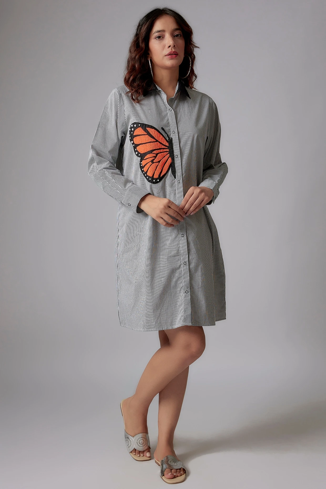 Featuring a black and white shirt dress in cotton poplin base with stripes and beaded butterfly detailing.