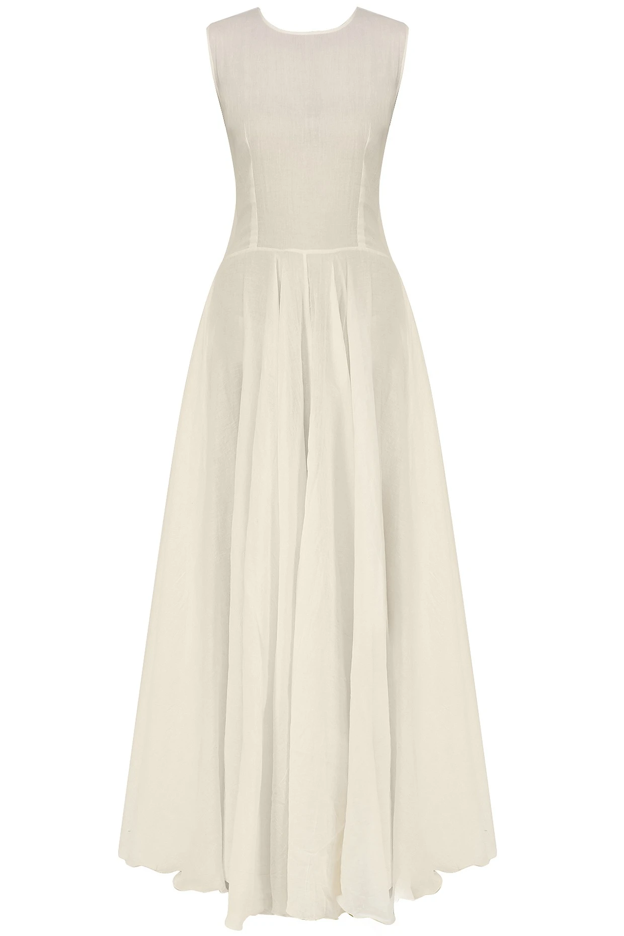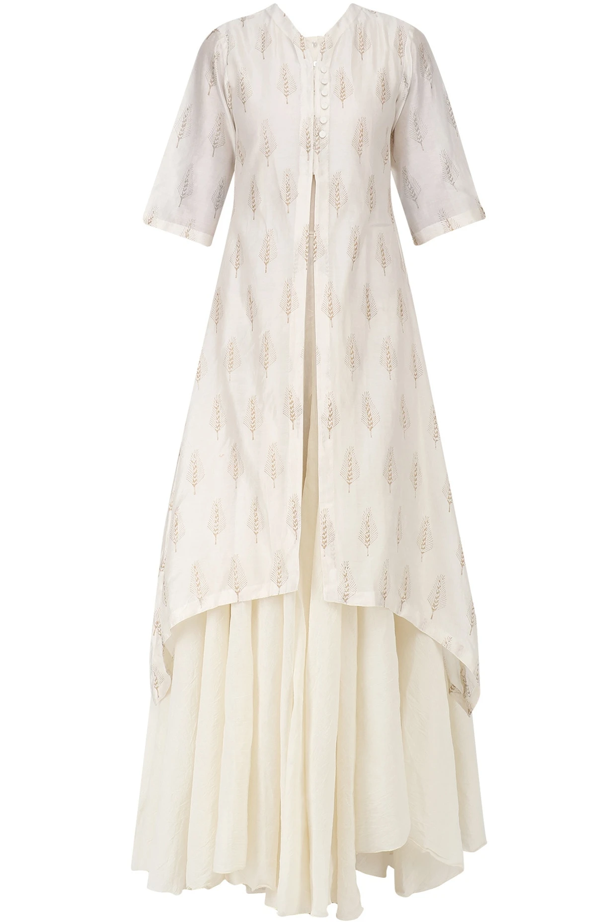 Featuring an off white front open asymmetric kurta in chanderi silk with block print all over. It is paired with off white long maxi dress in chanderi silk.