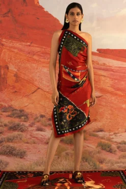 Featuring a multi-coloured ruched dress in silk satin base with wilding print.