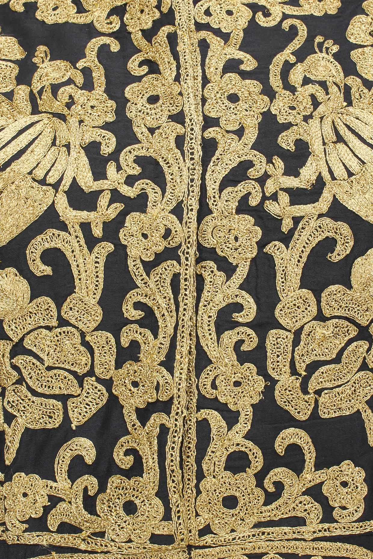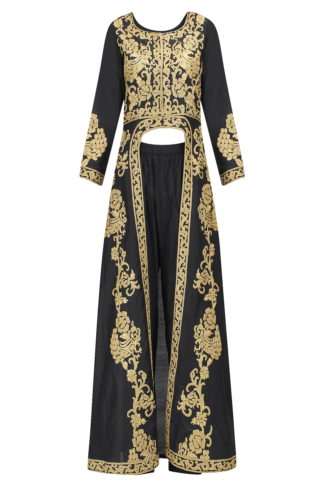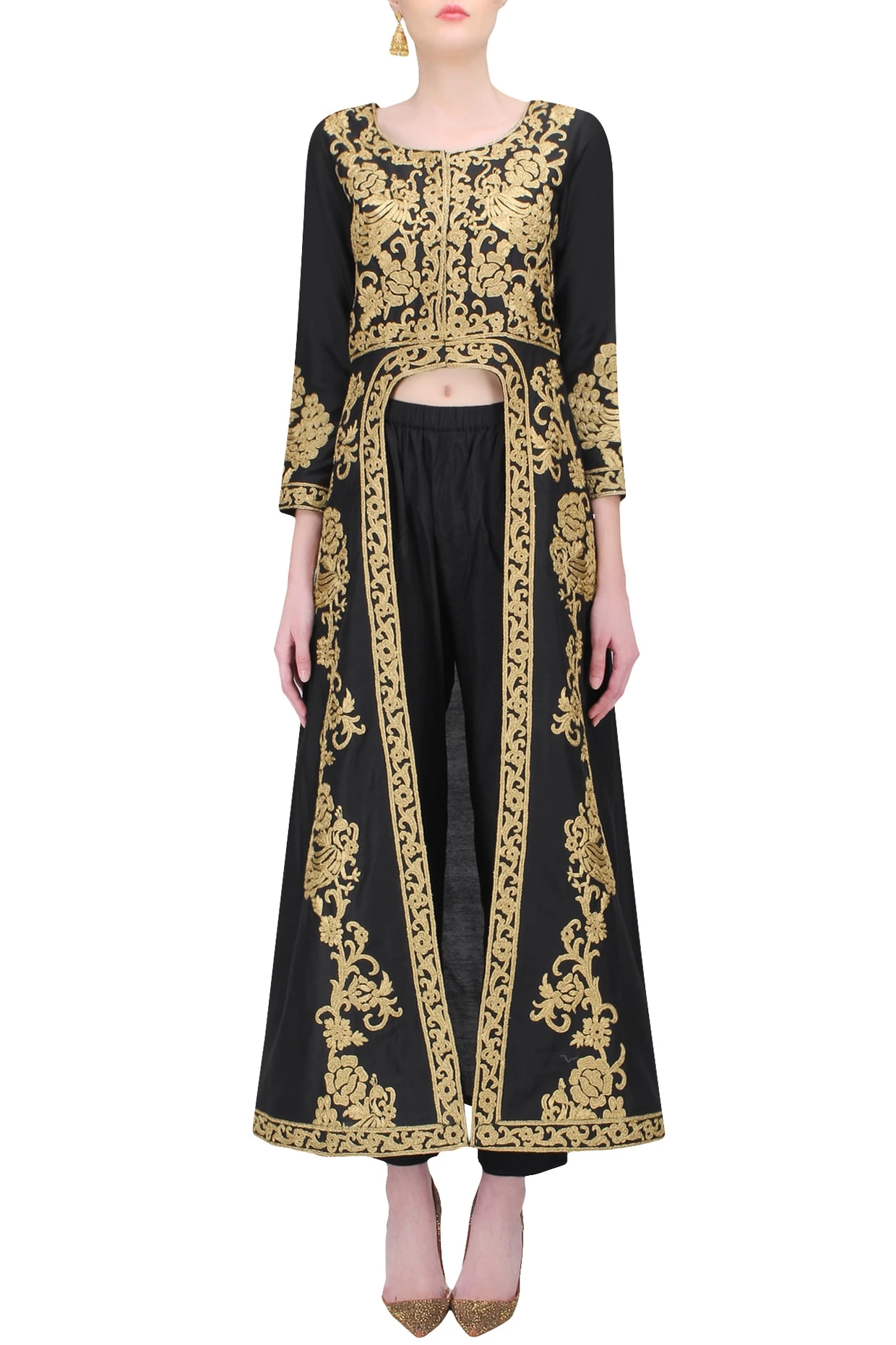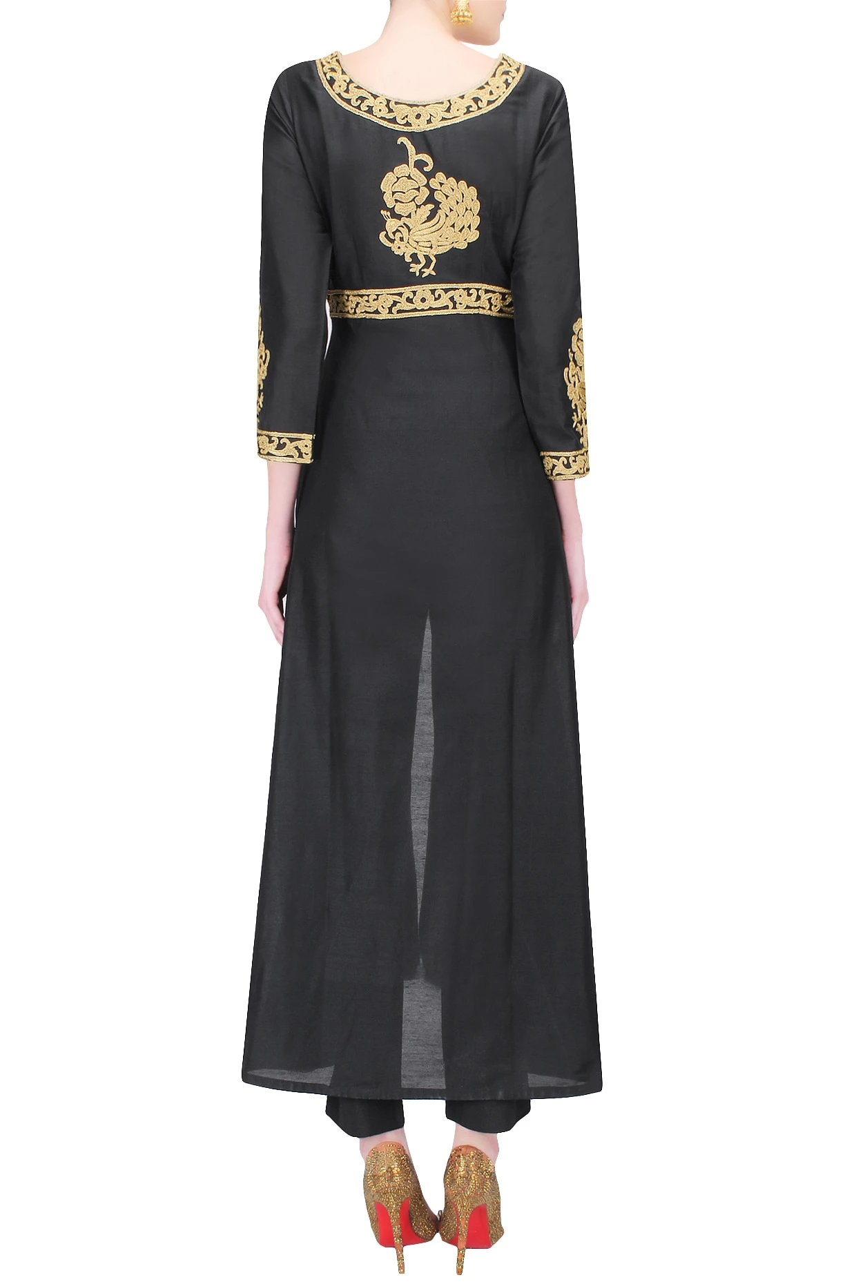 Featuring a black front open dress kurta in blended cotton silk with gold zari work all over. It comes along with black pants in cotton silk.