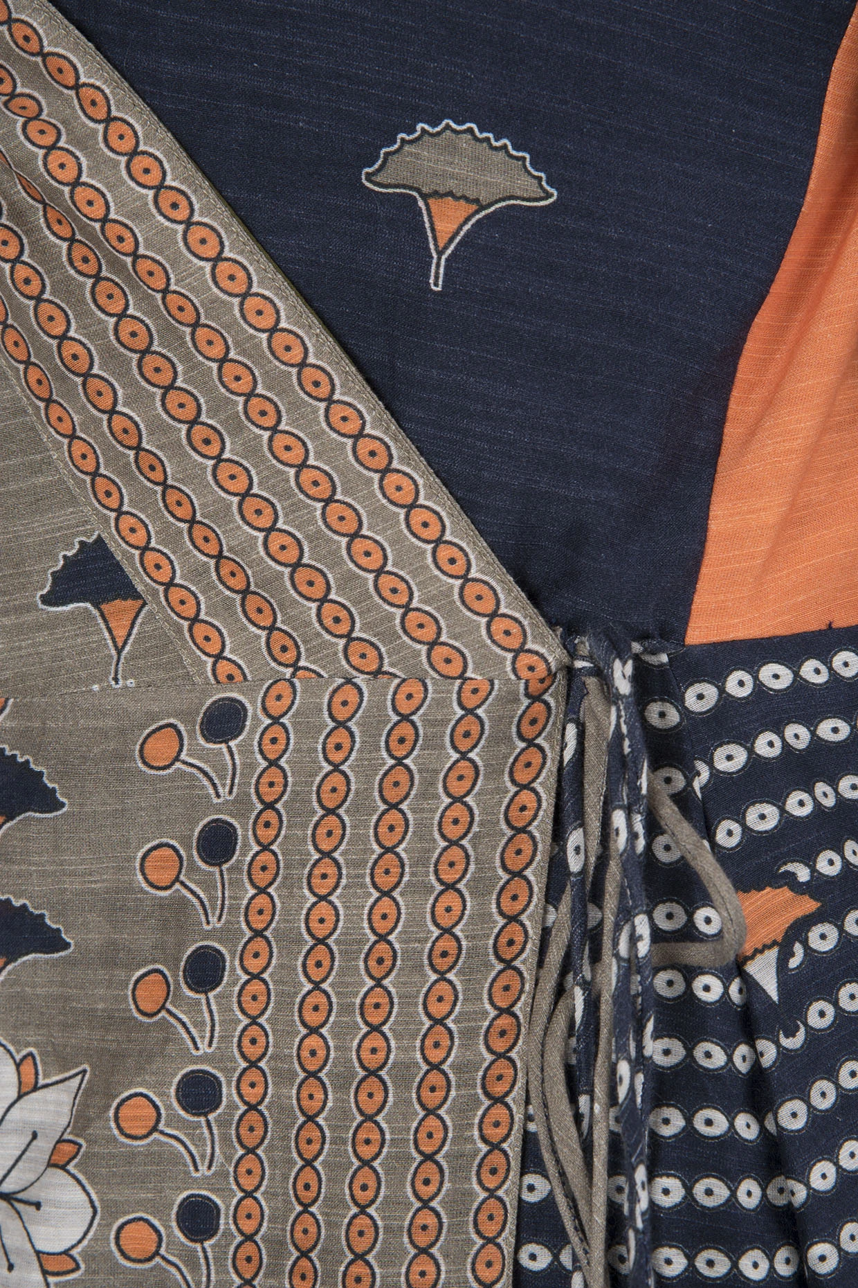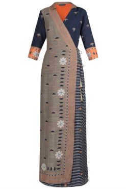 Featuring a beige and black wrap collar dress in slub chanderi base with print all over and a slit.