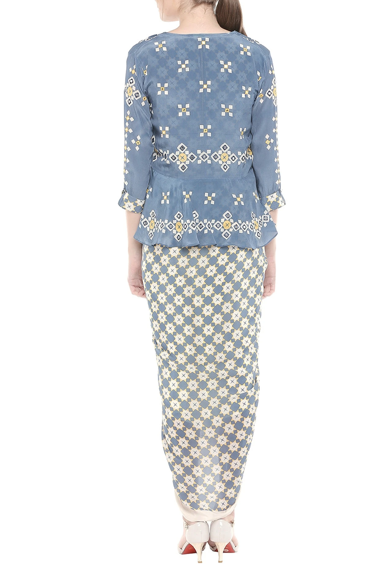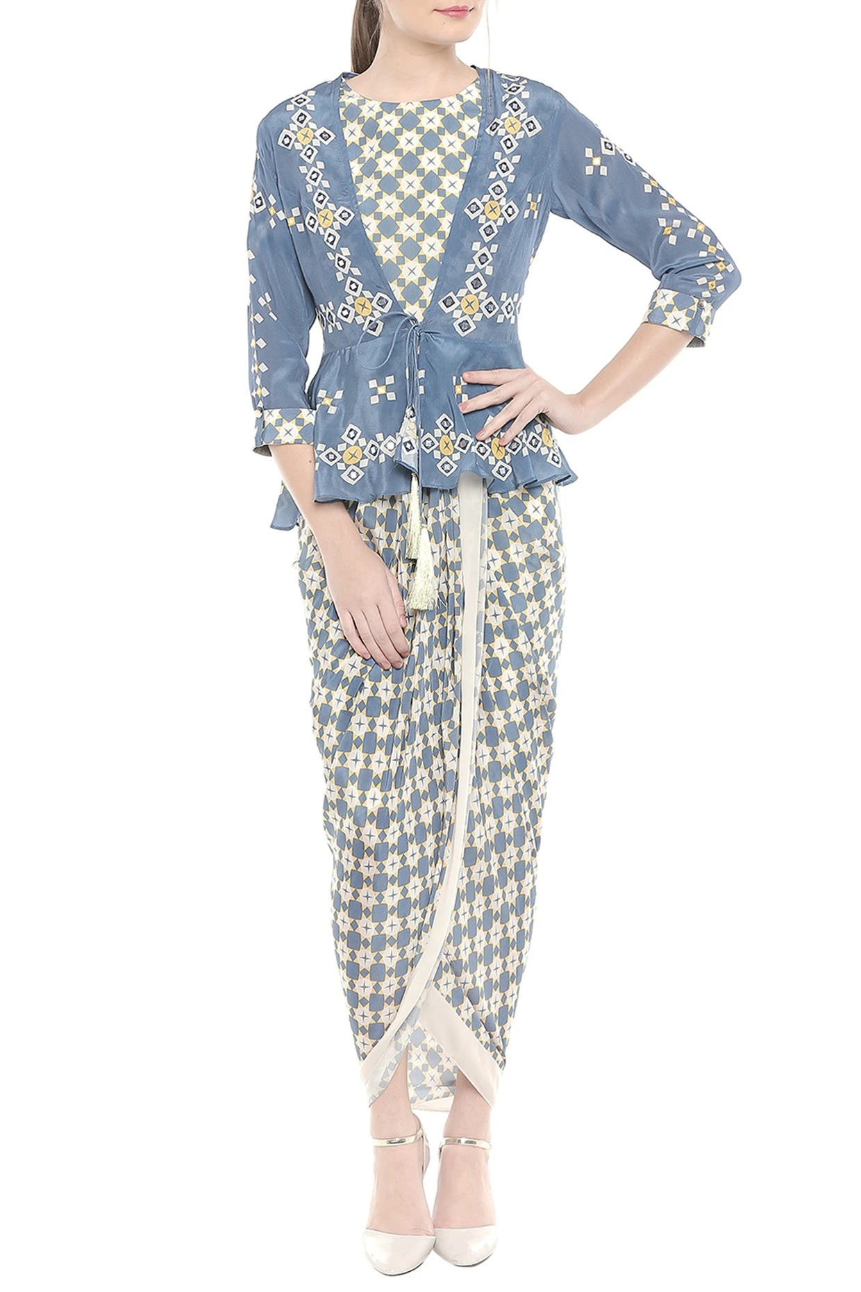 Featuring a beige and blue printed peplum jacket in crepe base with mirror embroidery. It is paired with matching draped dress.