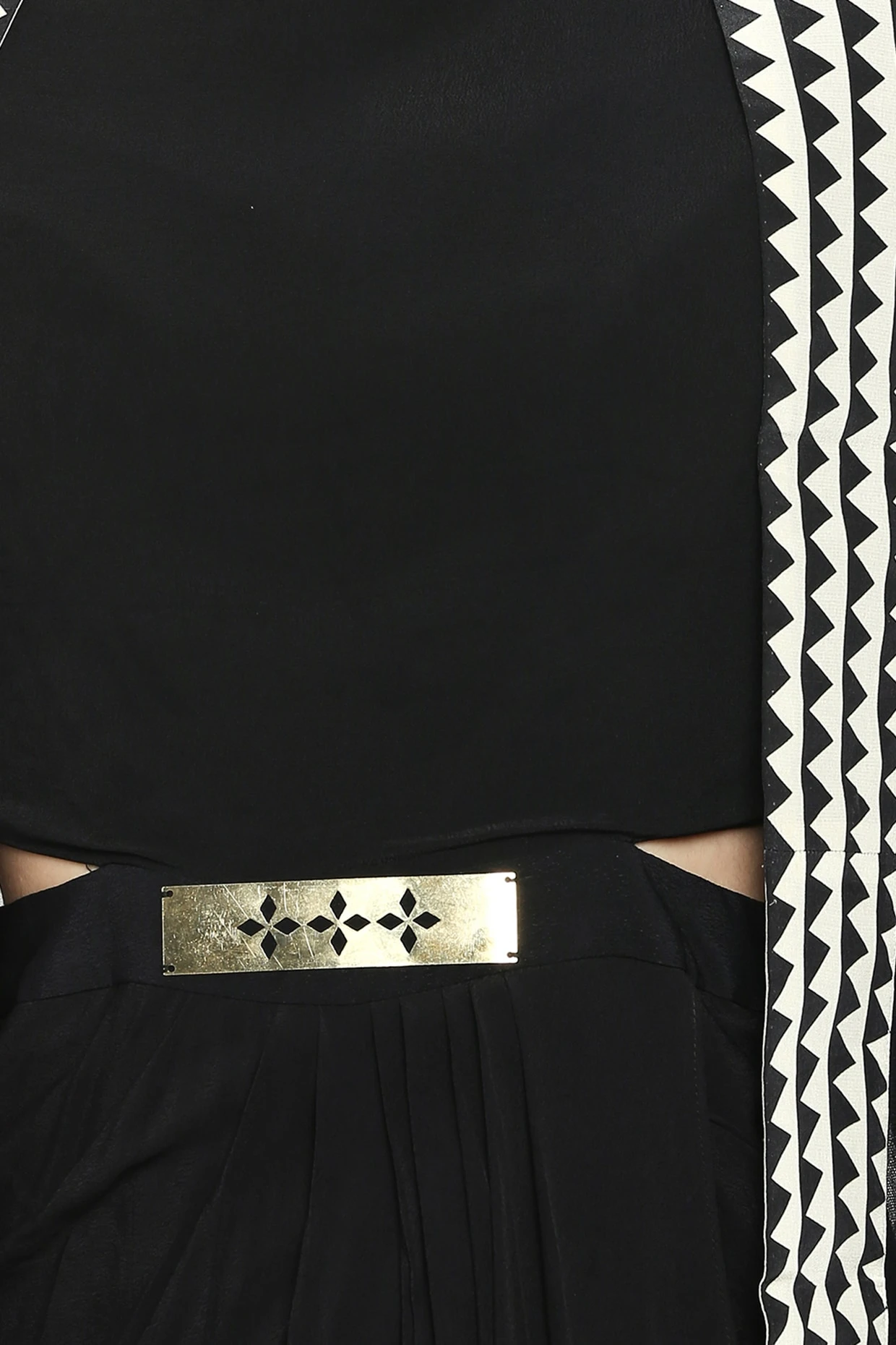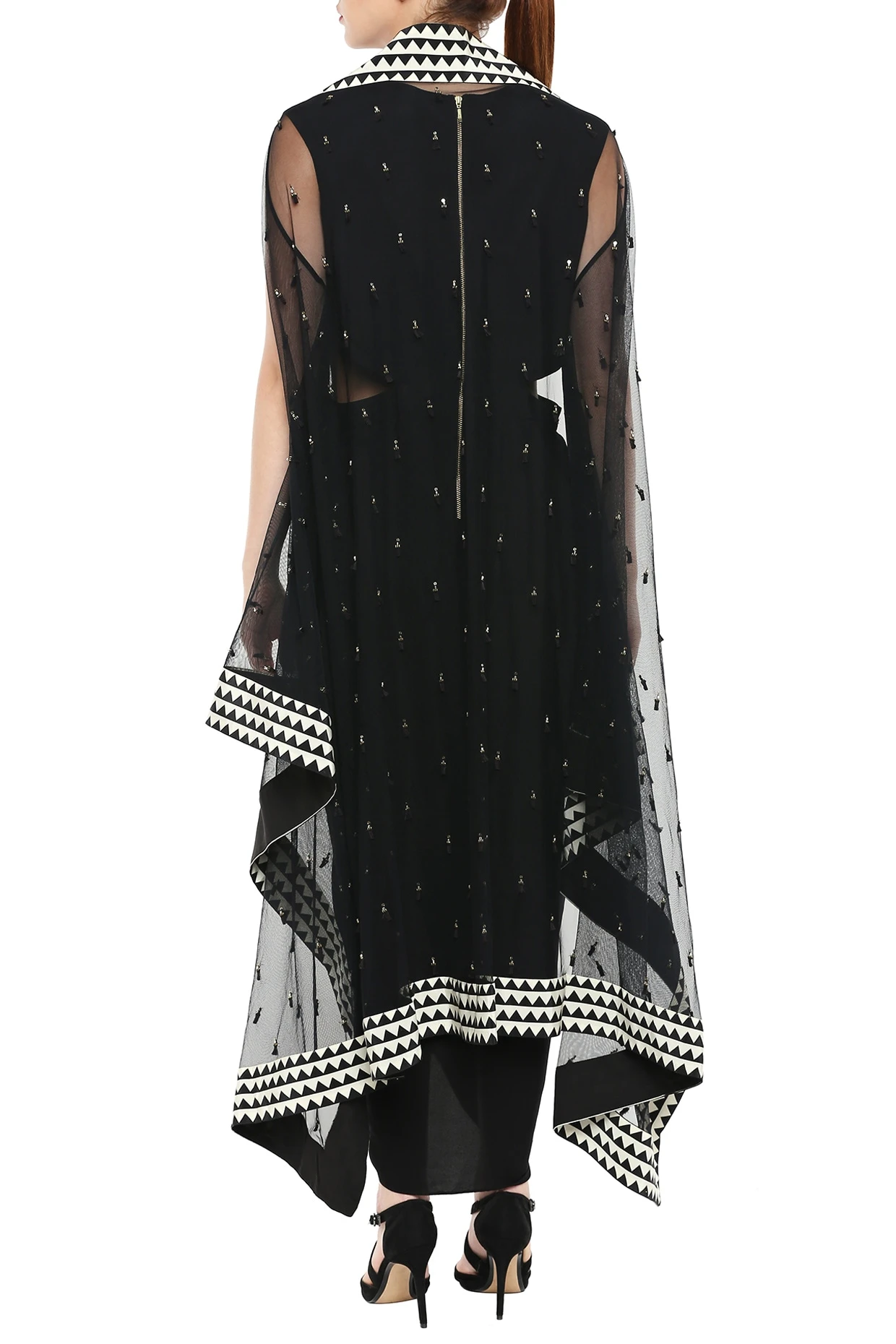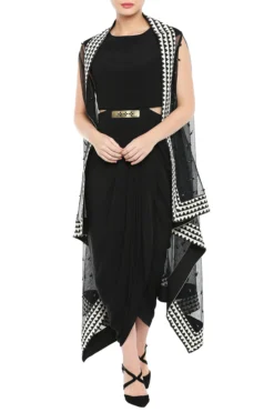 Featuring a black drape dress in crepe base with metal belt. It is paired with a matching white cape jacket in net base having hand embroidery.