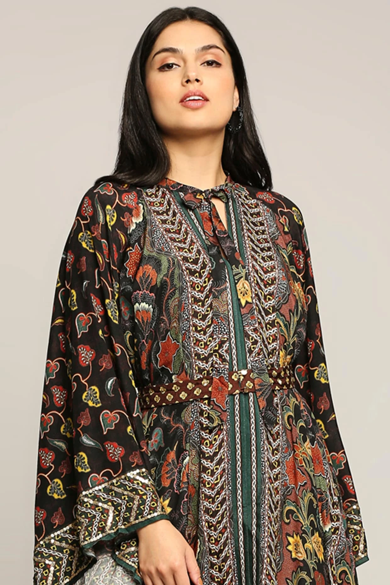 Featuring a black asymmetrical dress in muslin slub base with print.