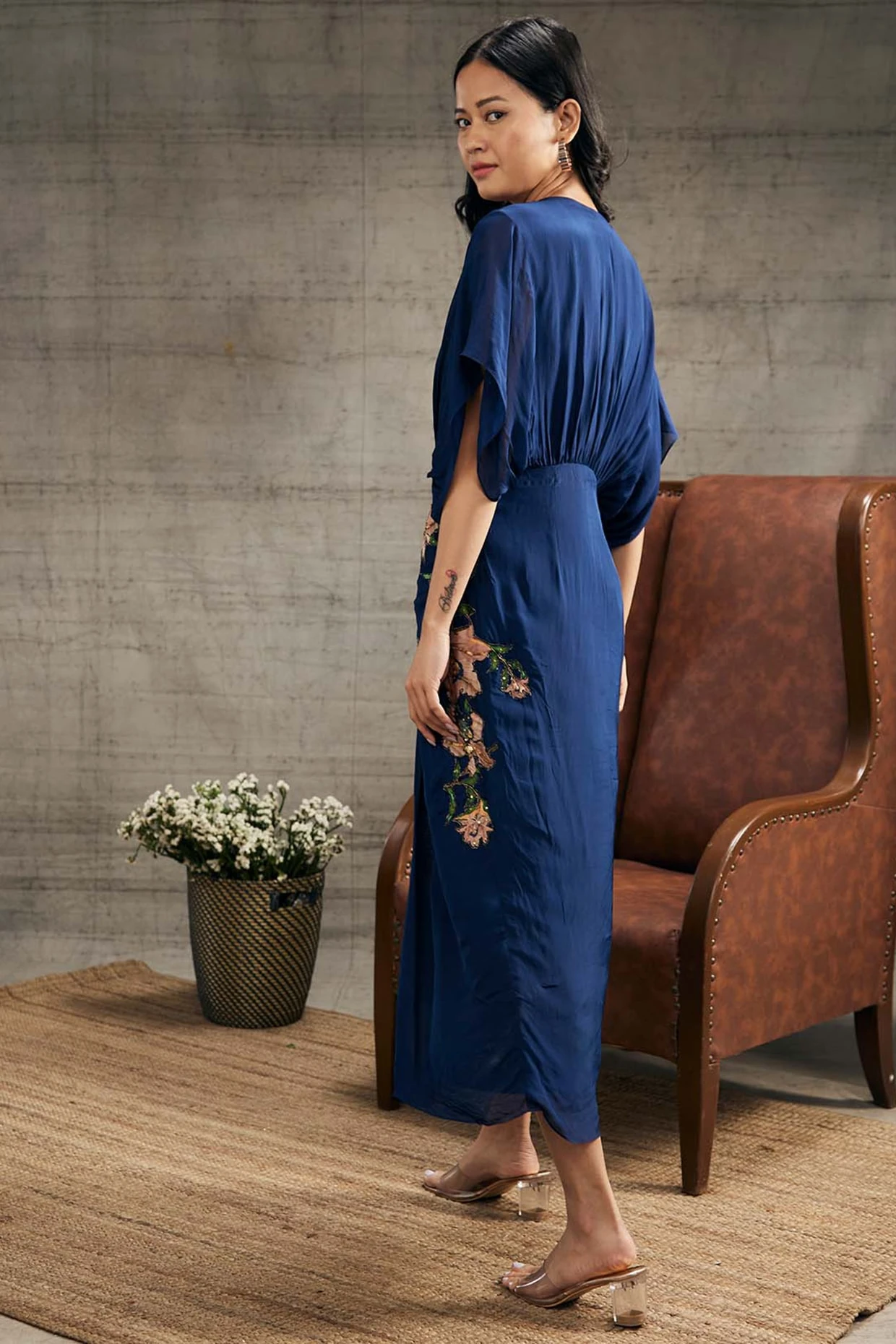 Featuring a blue dress in crepe base with patchwork embroidery.