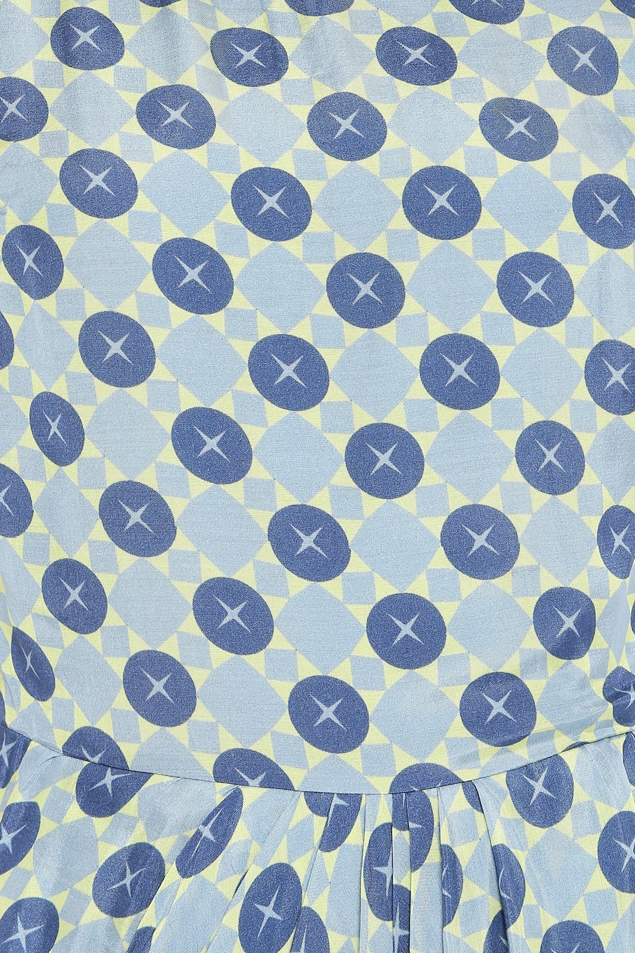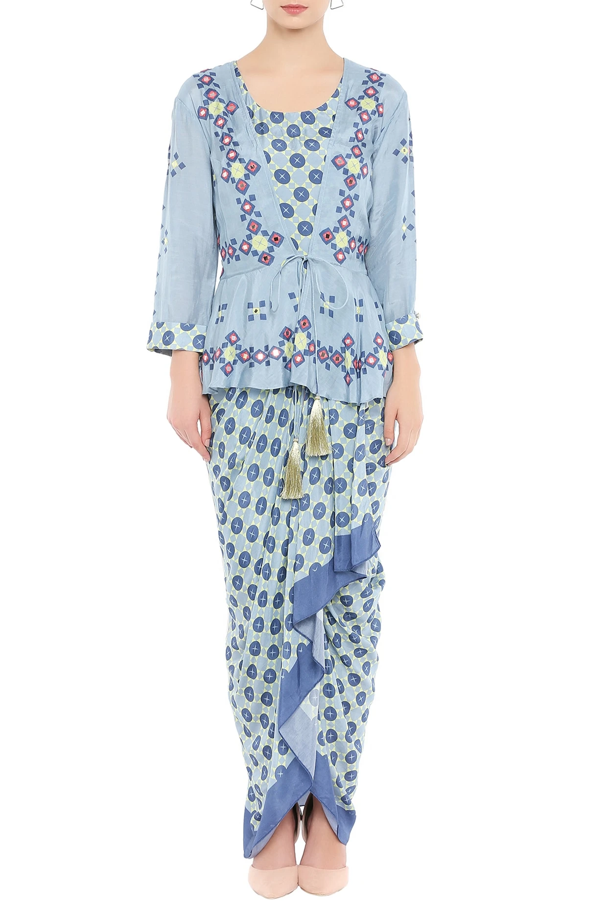 Featuring a blue draped dress in crepe base. It is paired with a matching peplum jacket having mirror embellishments and tassels.