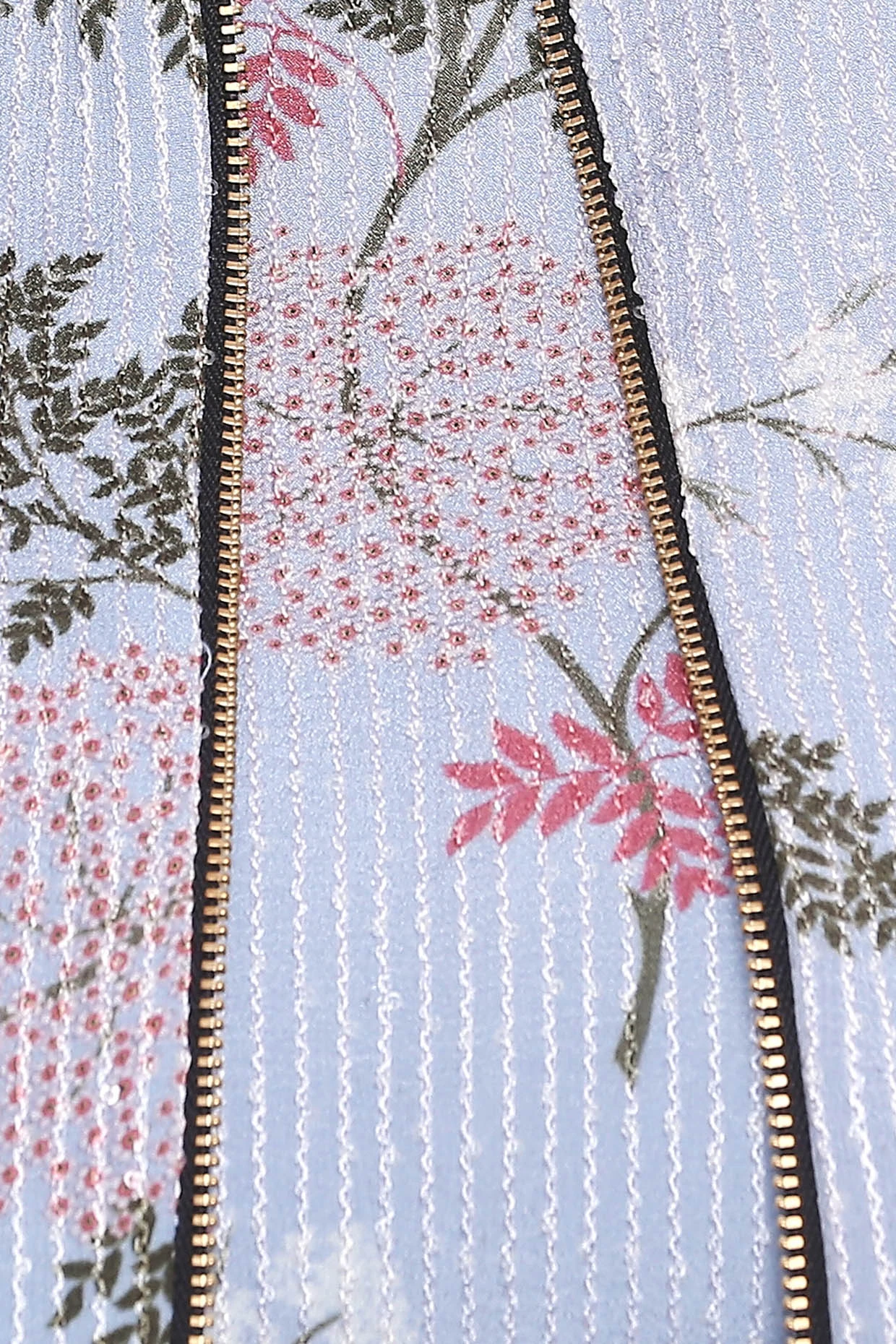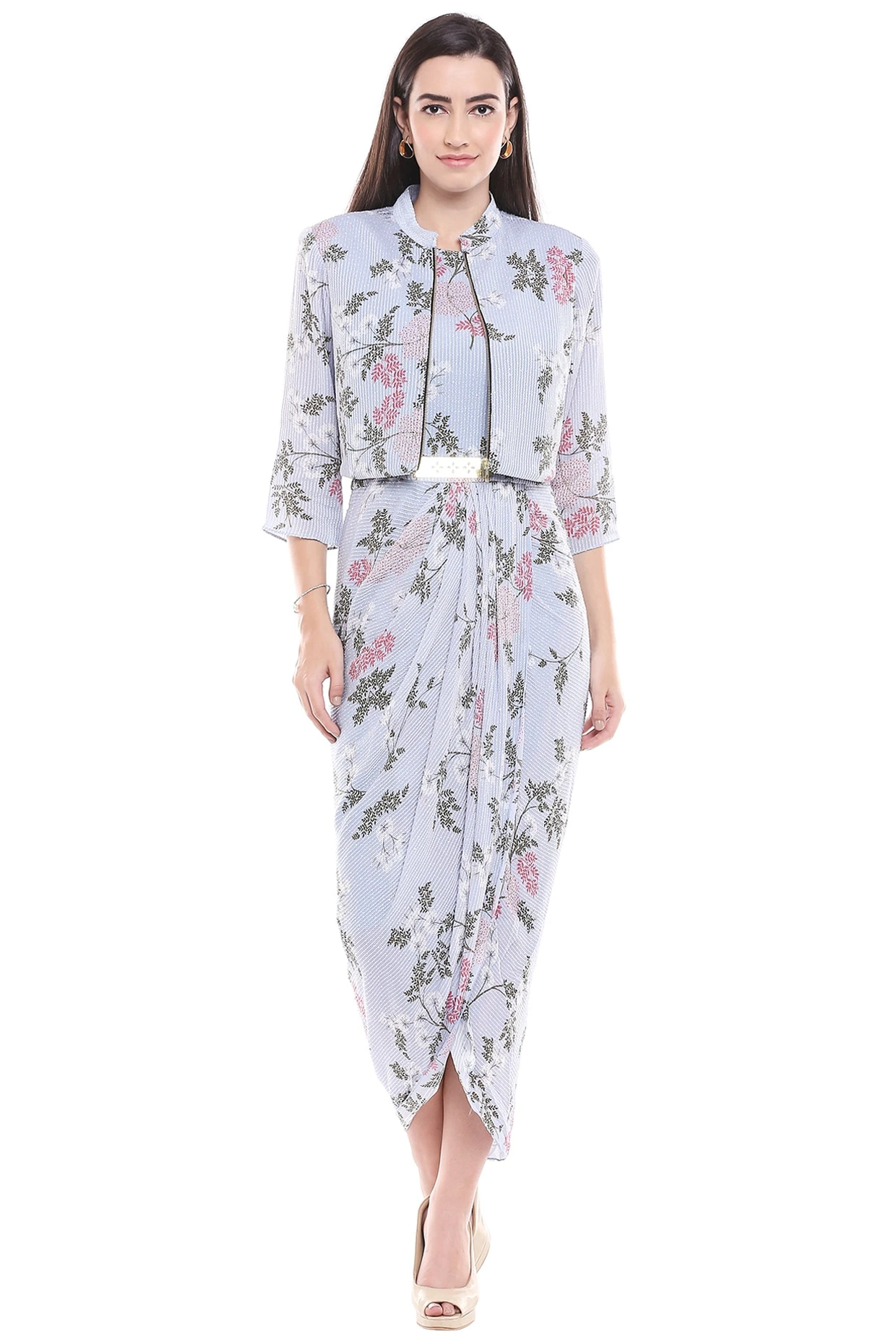 Featuring a blue draped dress in sequins fabric with floral print. It is paired with a matching jacket.