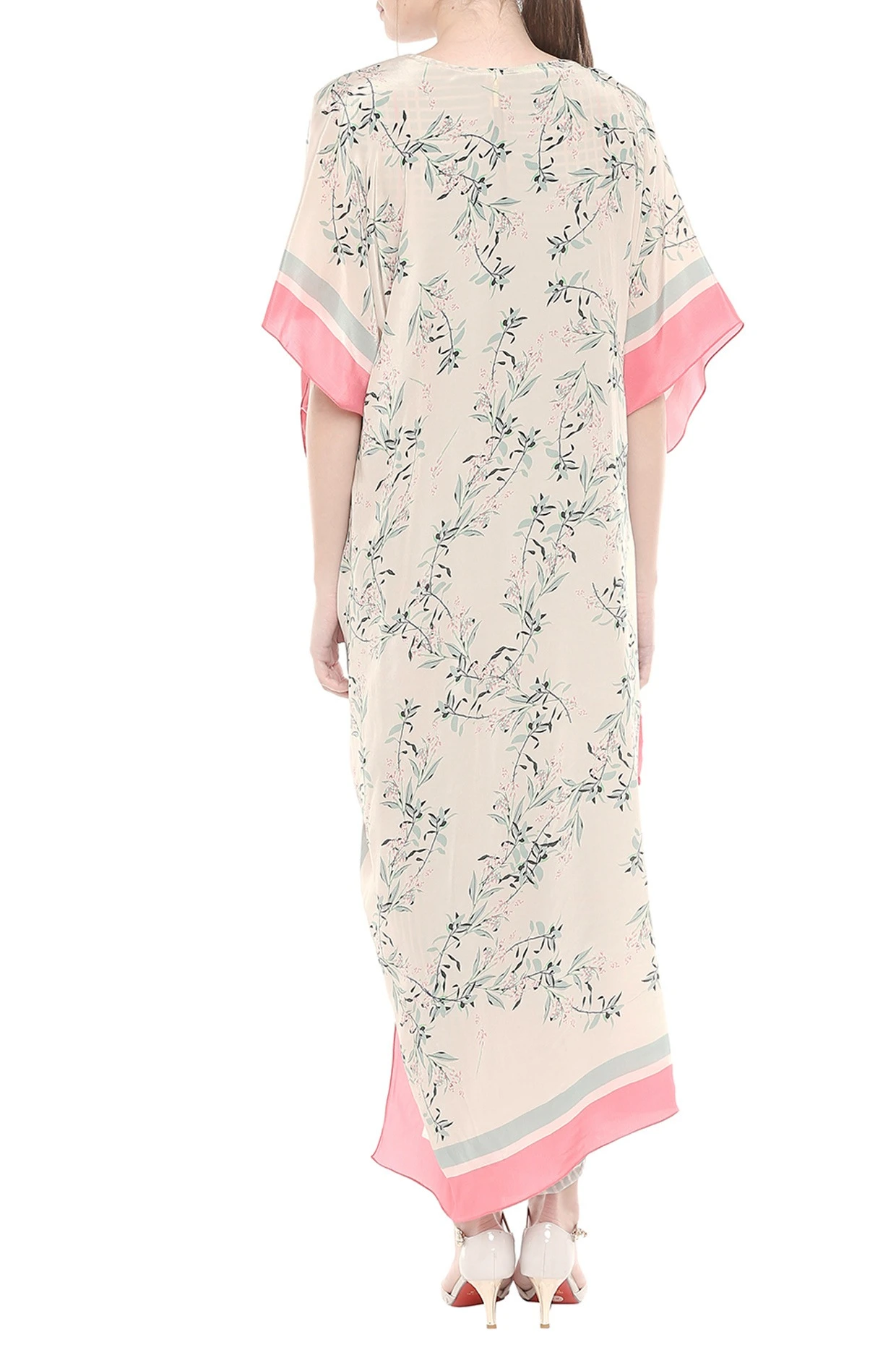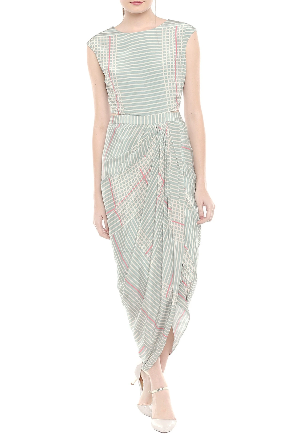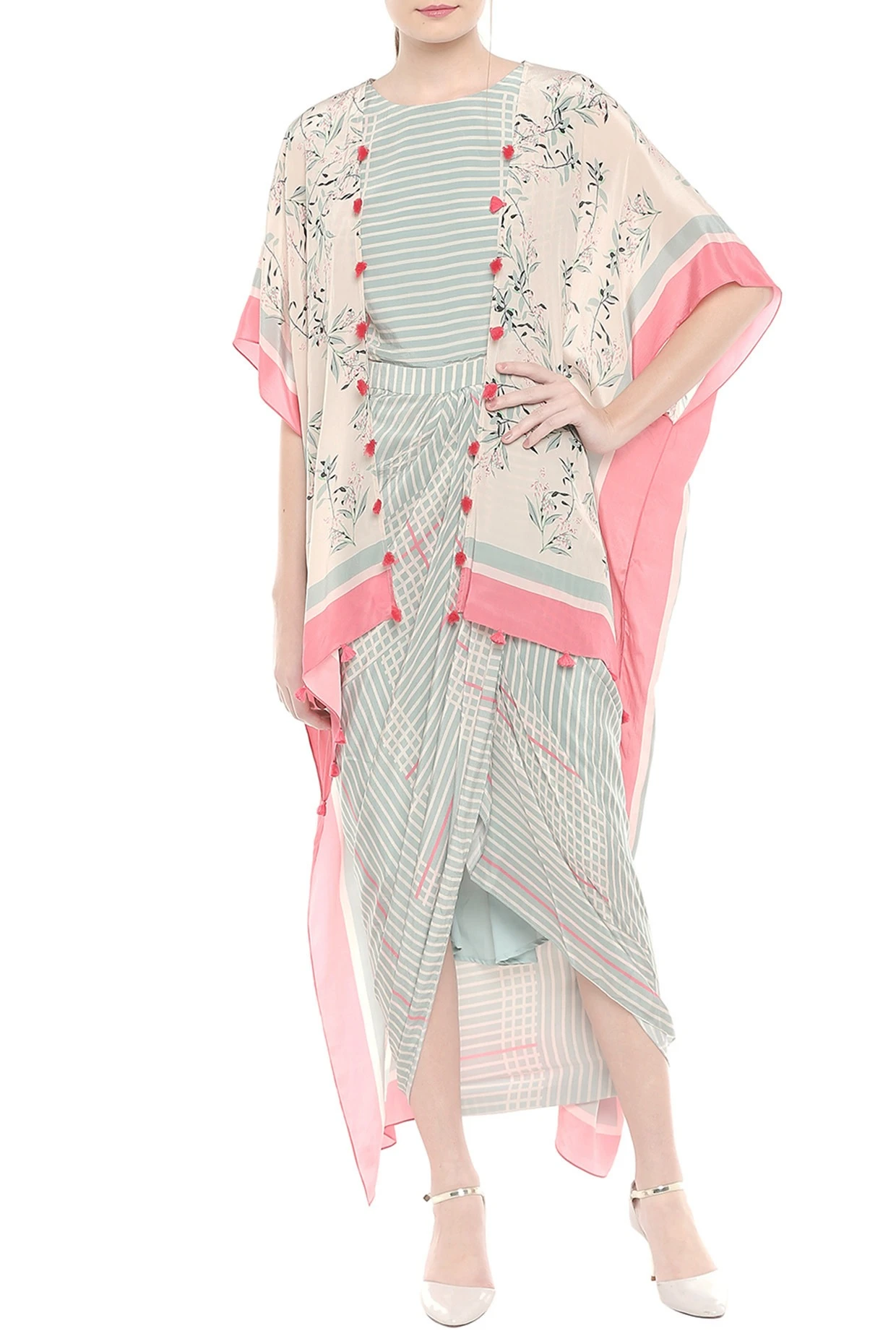 Featuring a blue and pink draped dress in crepe base with print. It is paired with matching asymmetrical cape jacket.