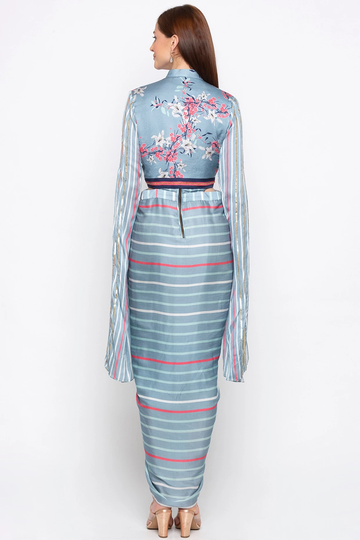Featuring a blue draped dress in crepe base with pink striped print. It is paired with a matching jacket having long sleeves and sequins embroidery.