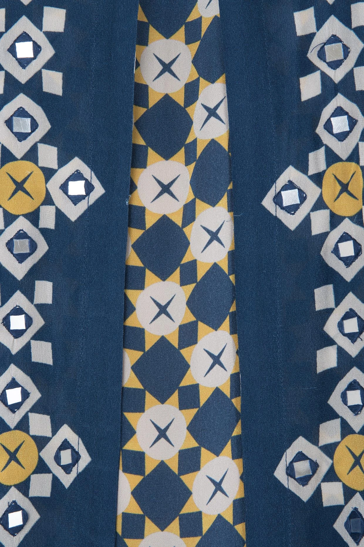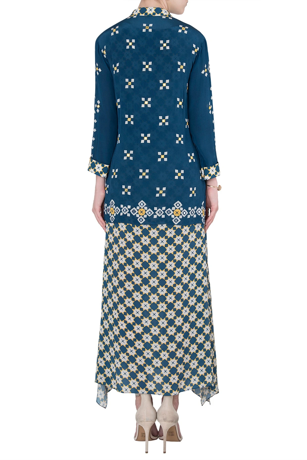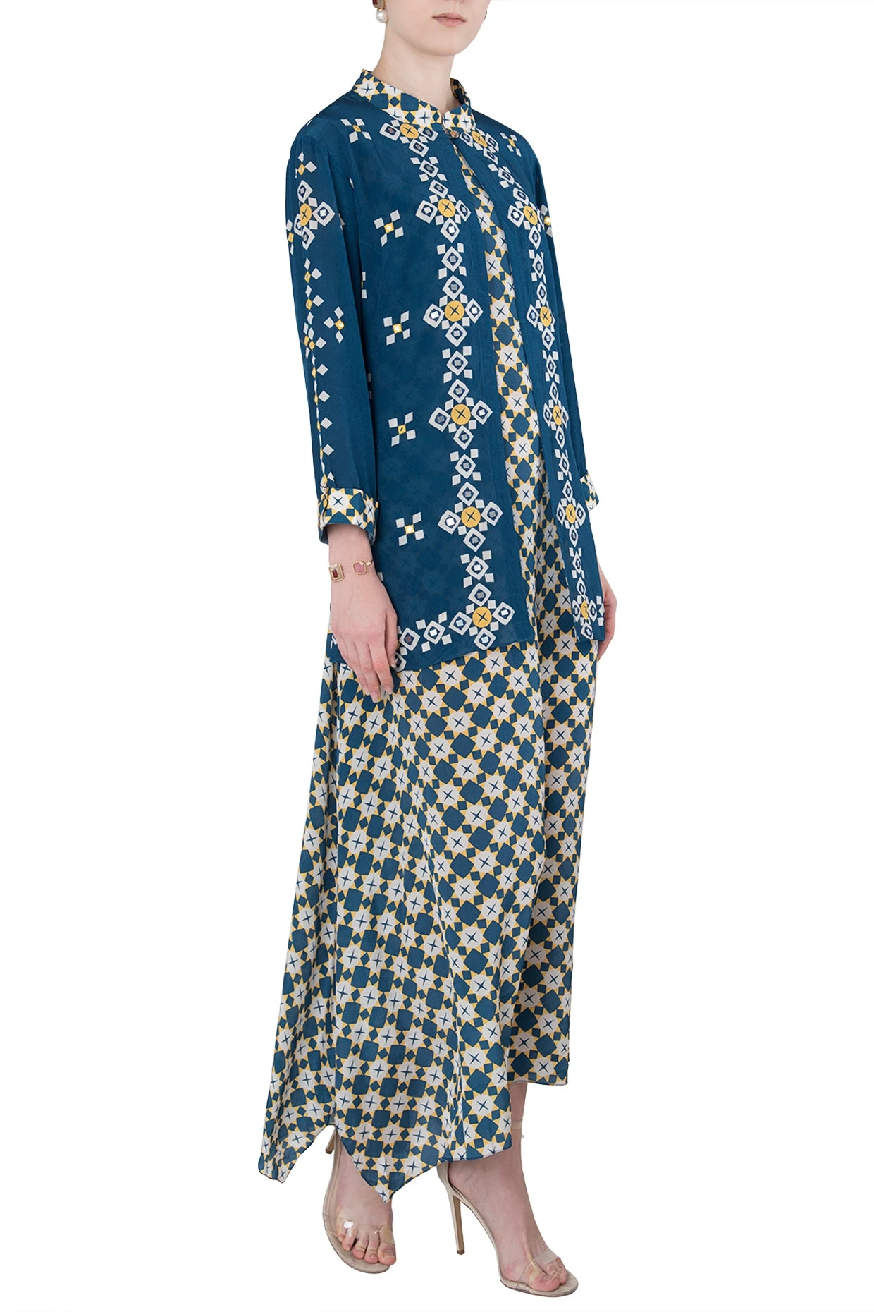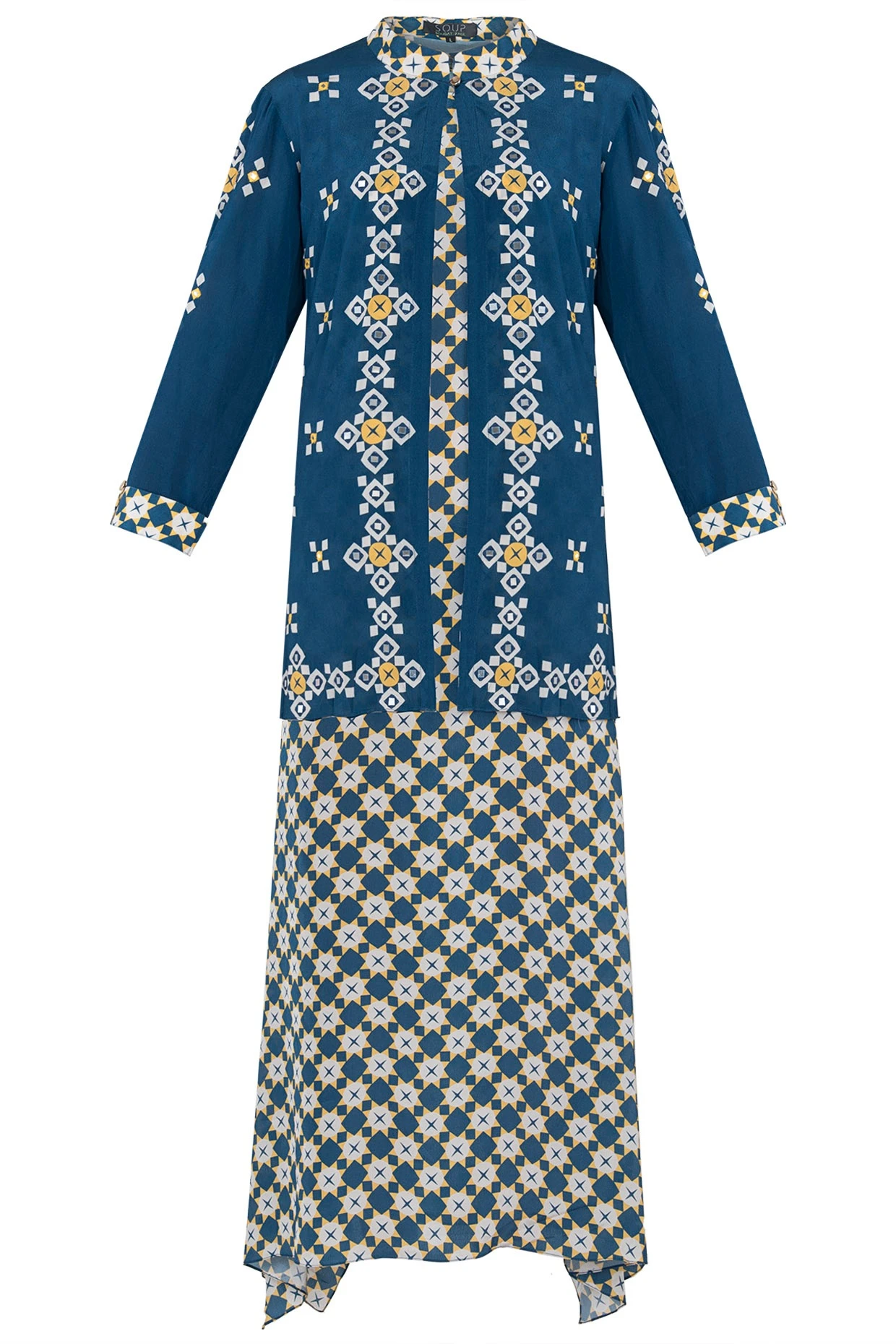 Featuring a blue printed maxi dress in crepe base with an embroidered overlay jacket.