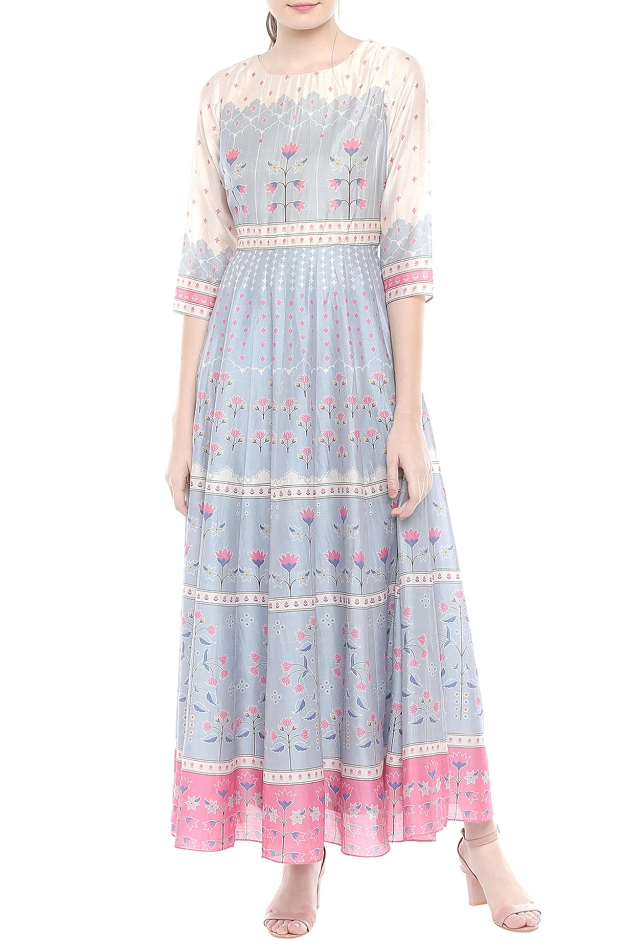 Featuring a blue maxi dress in chanderi base with pink and beige printing.