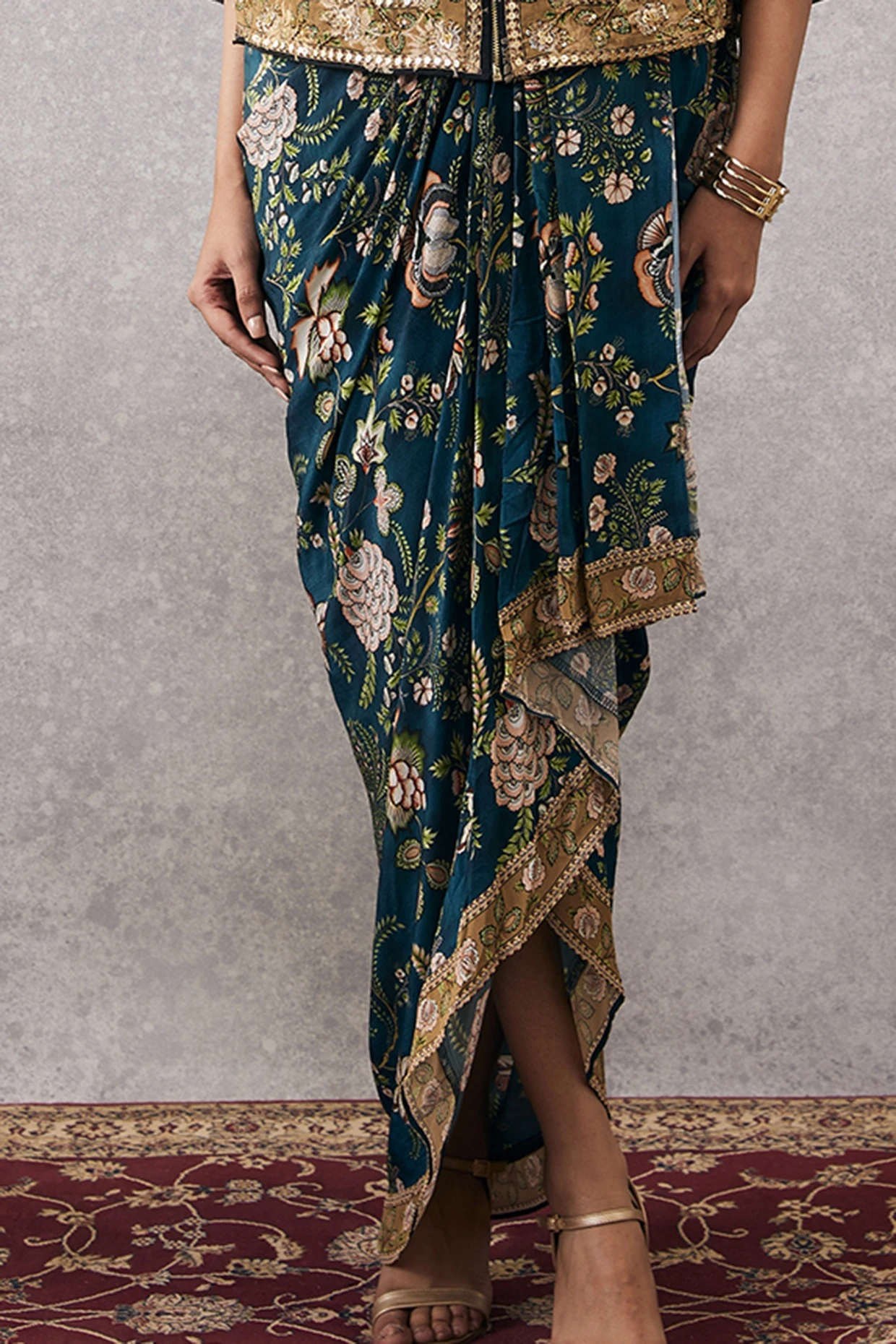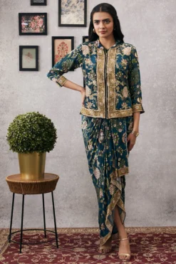 Featuring a green draped dress in crepe and malaysian silk base with print. It is paired with a matching jacket.