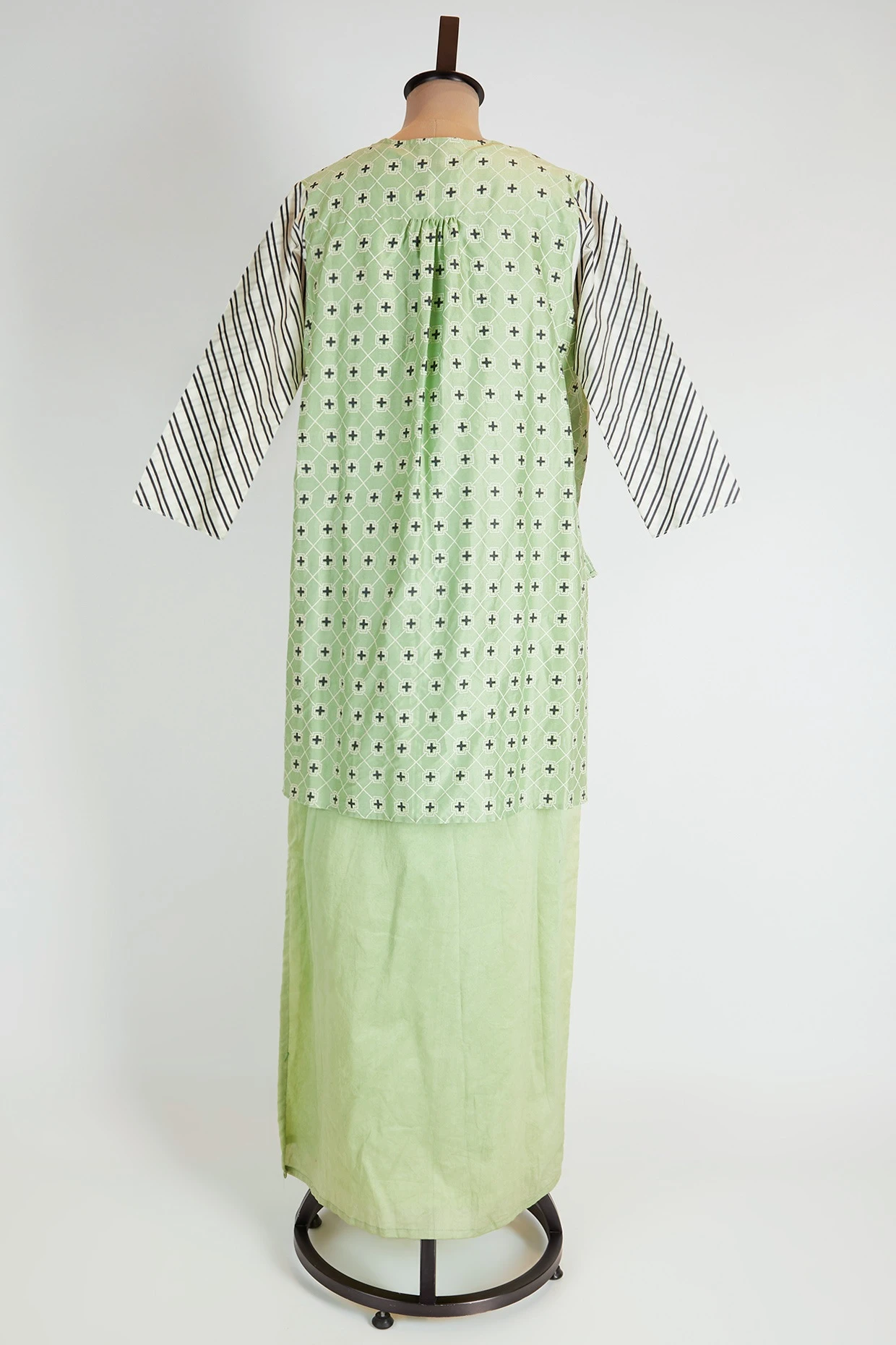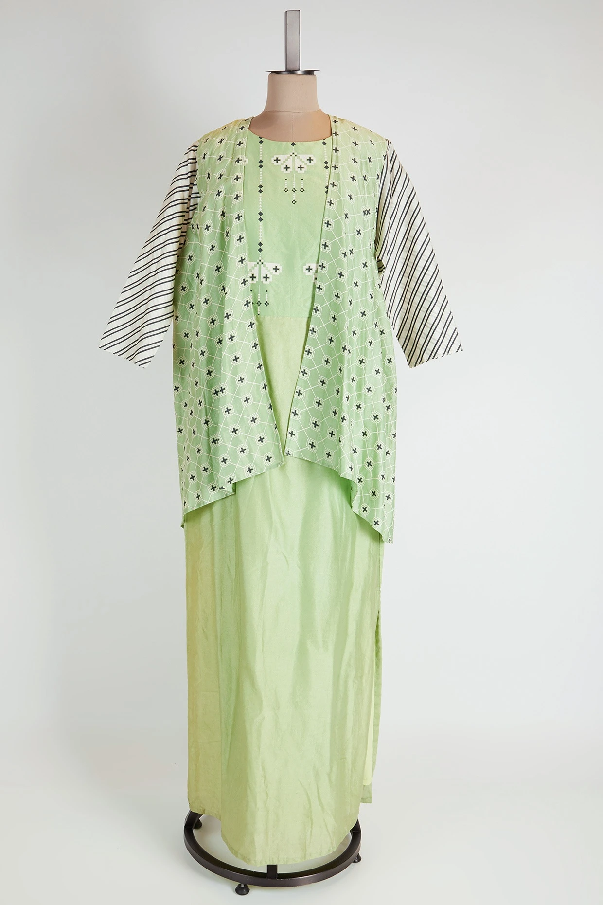 Featuring a green straight dress in crepe base. It is paired with a matching printed jacket.