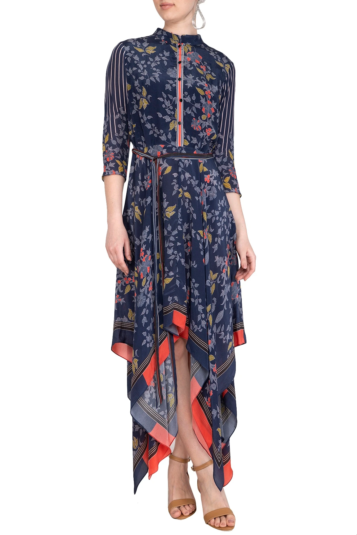 Featuring an indigo blue high neckline dress in crepe base with handkerchief bottom and all over print and embroidery.