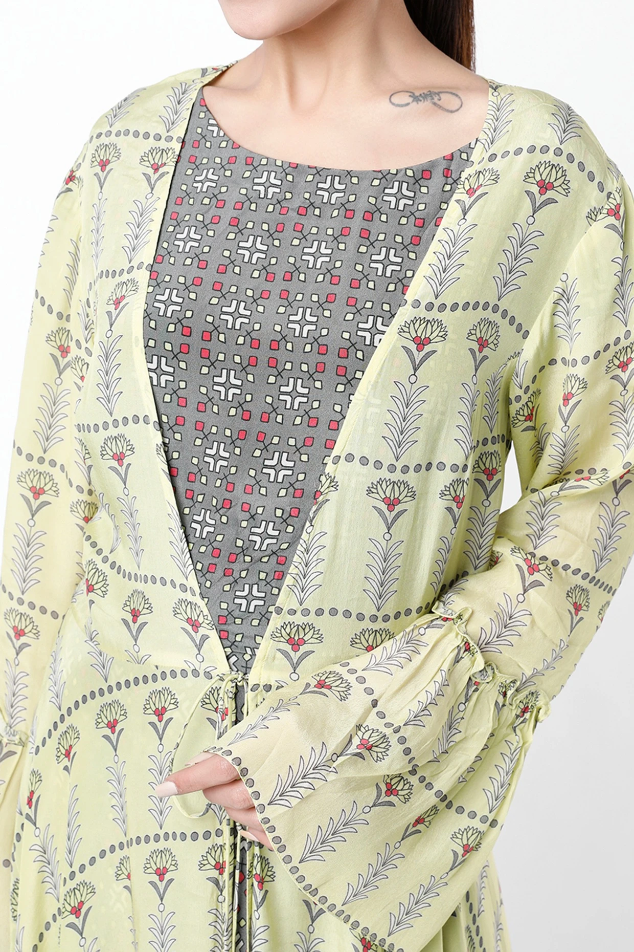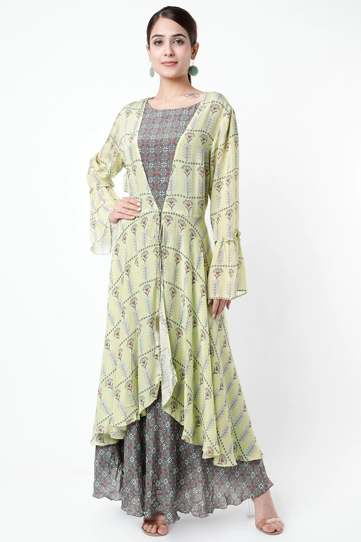 Featuring a mirage blue dress in crepe base with print. It is paired with a contrasting mint printed jacket.