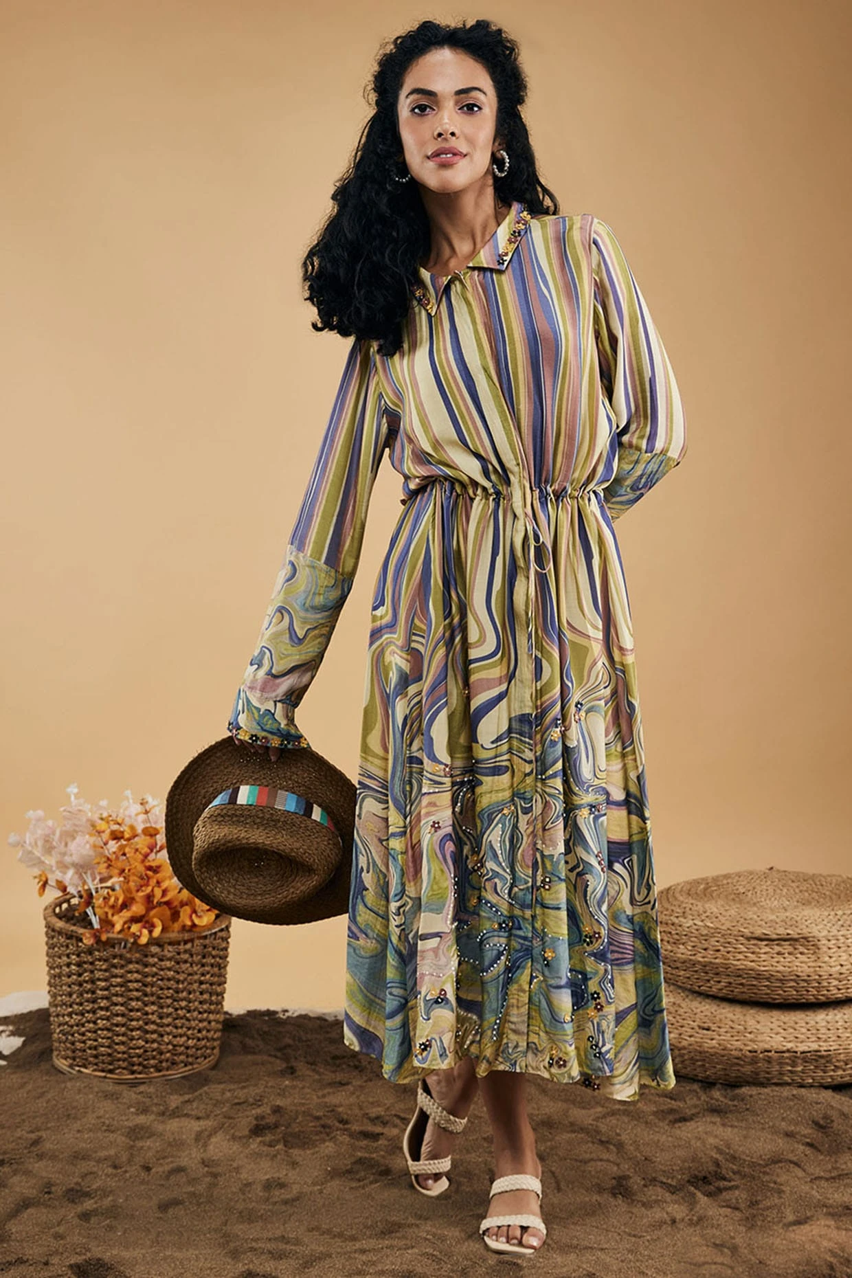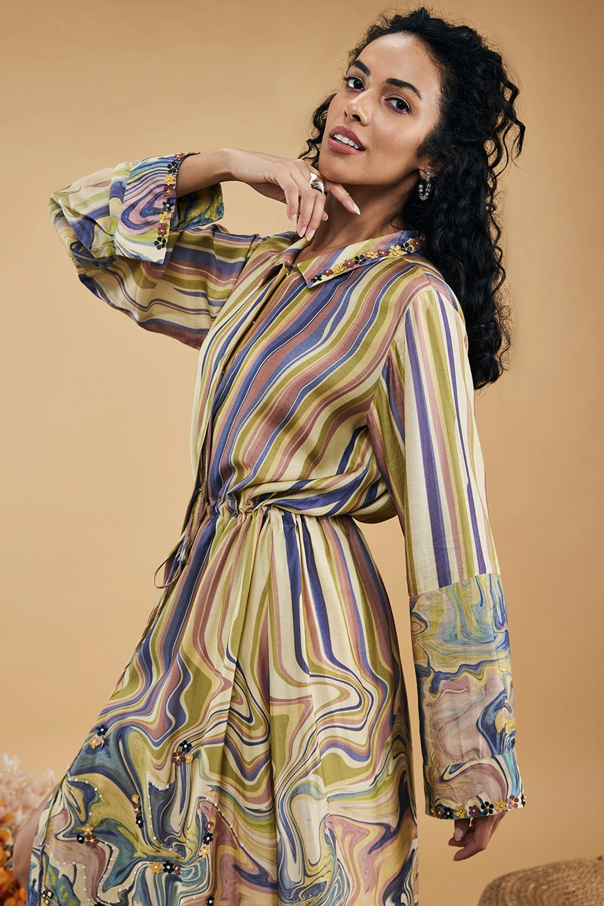 Featuring a multi-colored dress in cotton silk base with marble print.