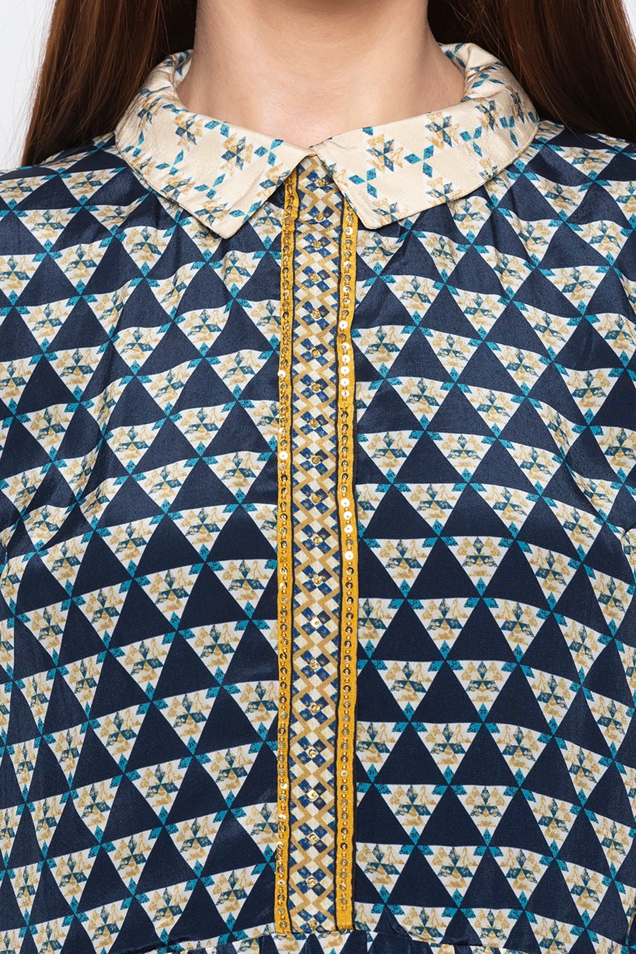 Featuring a multi colored dress in crepe base. It has pleats, placket enhanced and embroidery.