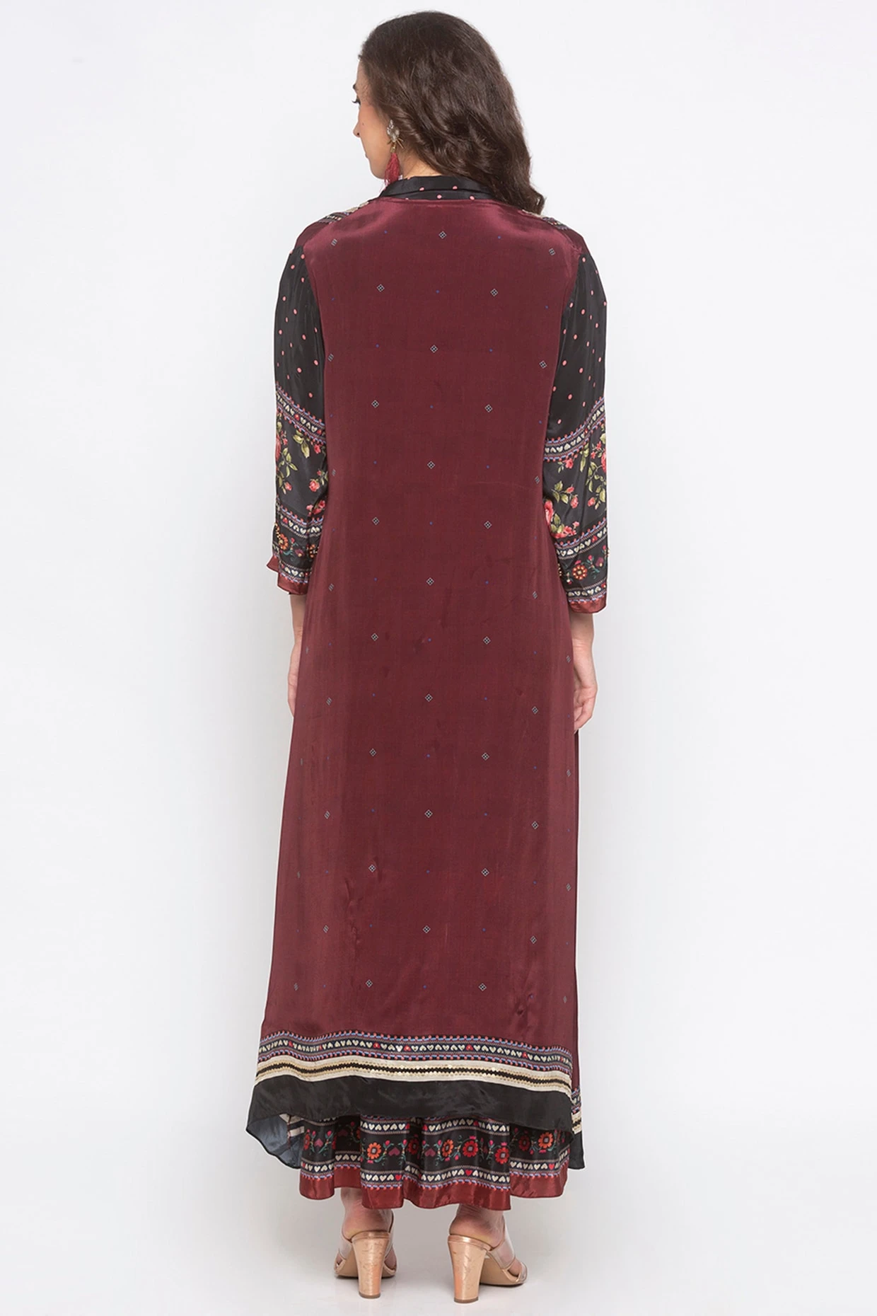 Featuring a multi colored jacket in crepe base with hand embroidery and print. It is paired with a matching maxi dress.