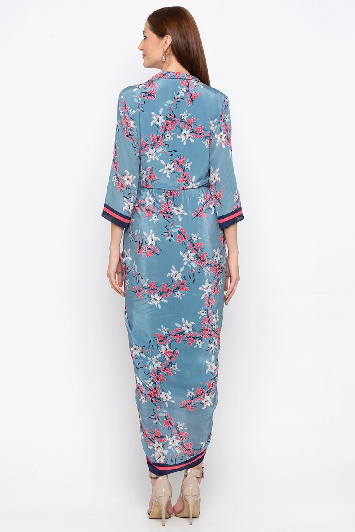 Featuring a blue wrapped dress in crepe base. It has pink and white print including embroidery.
