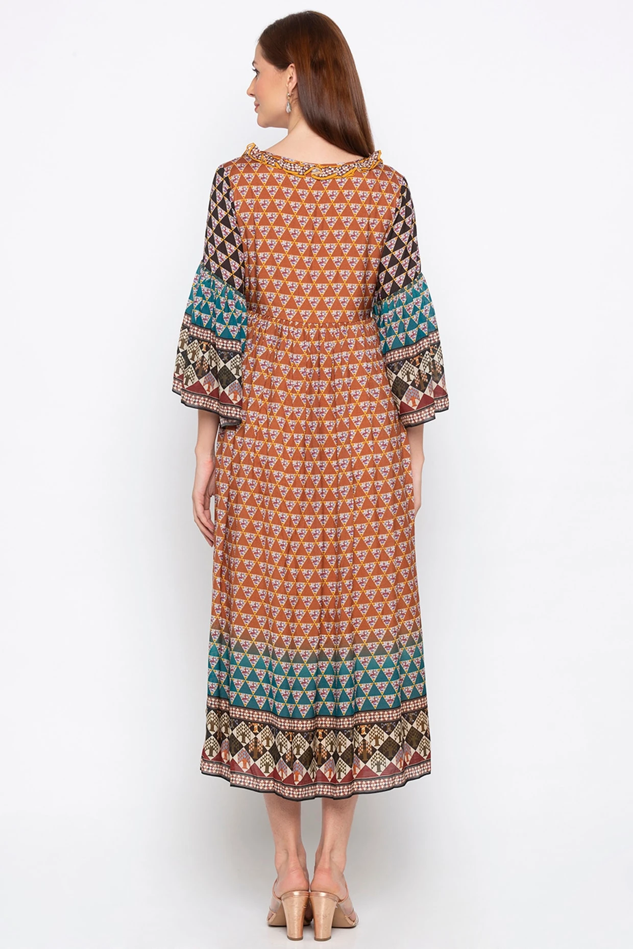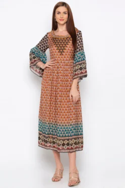 Featuring a multi colored dress in muslin slub base. It has blue print, gathers on the sleeve and mirror embroidery on the yoke.