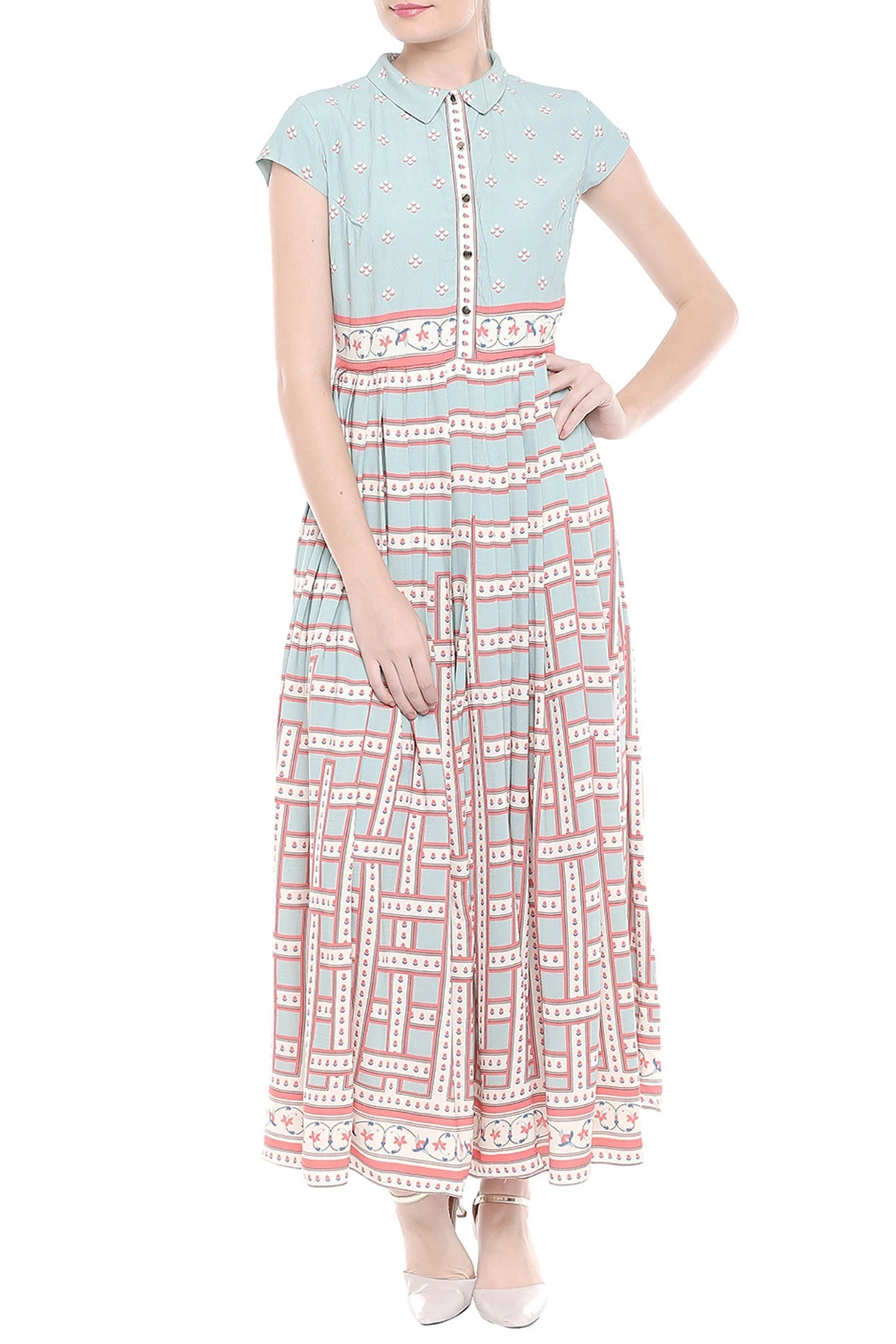 Featuring a multi colored printed maxi dress in tencel crepe base with knife pleats. It is paired with matching long jacket.