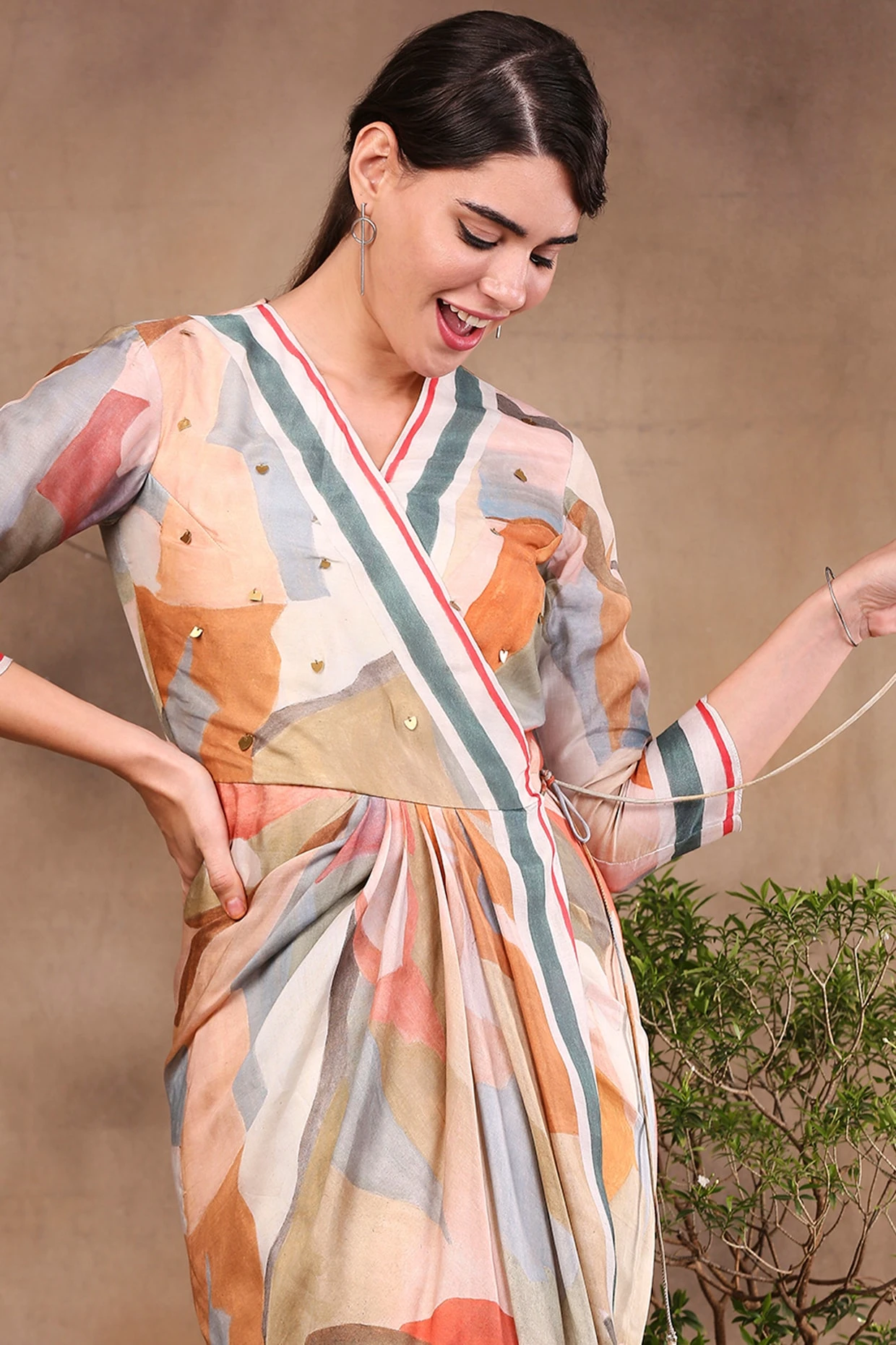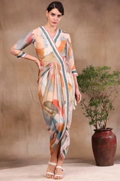 Featuring a multi-colored overlap dress in cotton silk base with print.