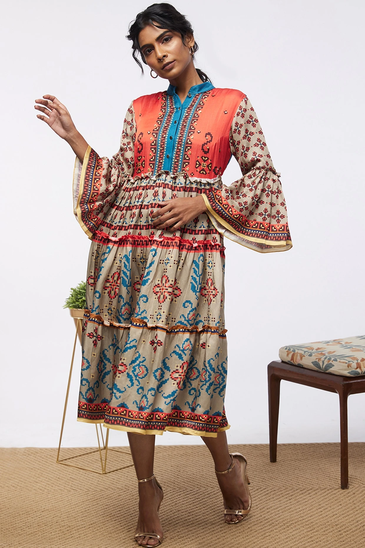 Featuring a multi-coloured tiered dress in satin linen base with print.
