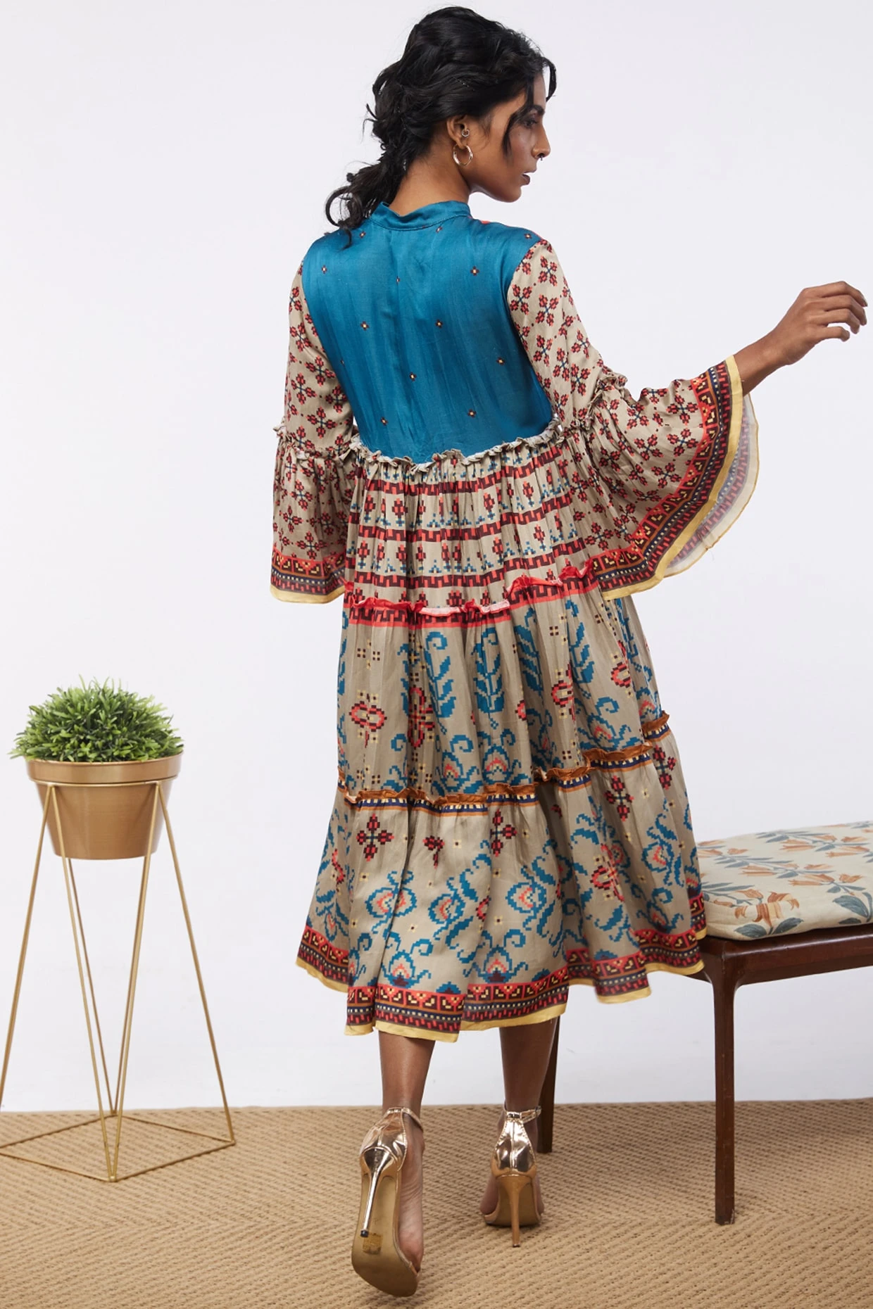 Aditi Somani Beige Modal Satin Printed & Embroidered Overlay Dress
