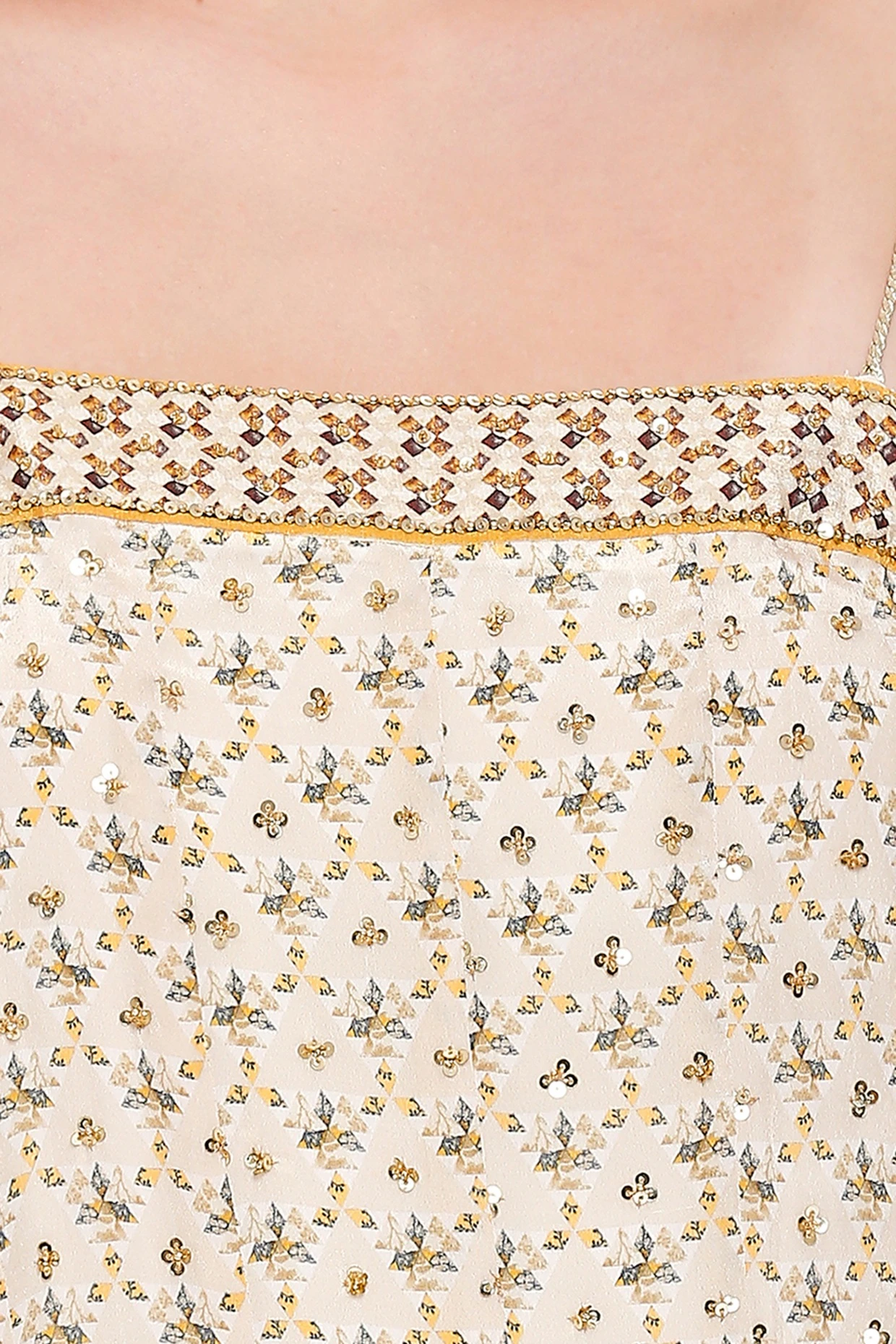Featuring a mustard dress in crepe base with print and noodle straps.