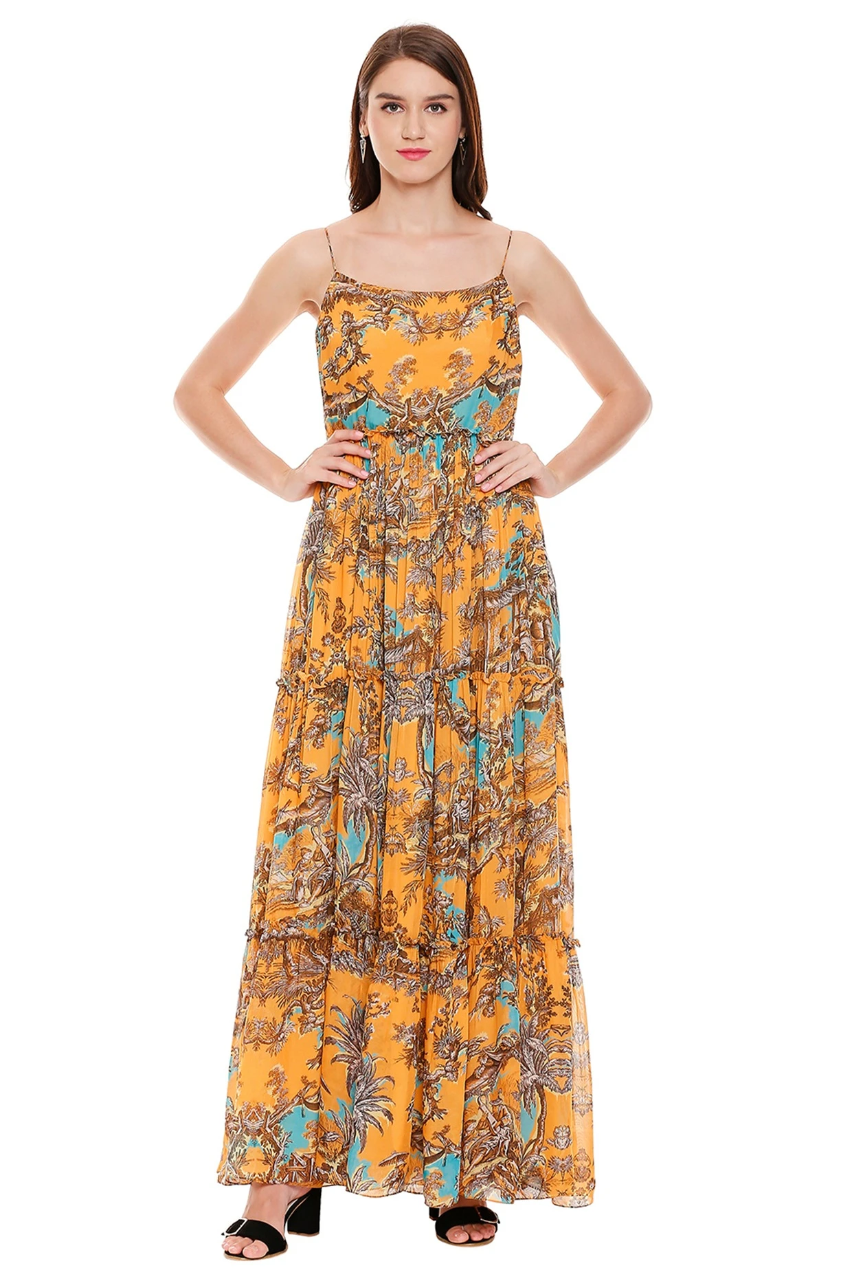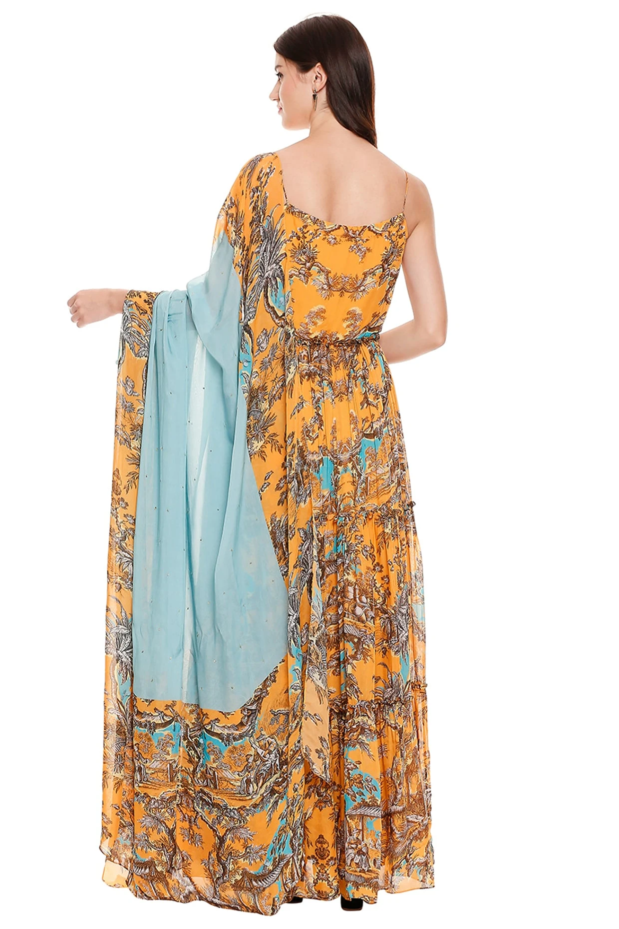 Featuring a mustard yellow and beige maxi dress in chiffon base with print and gathers. It is paired with a matching dupatta.