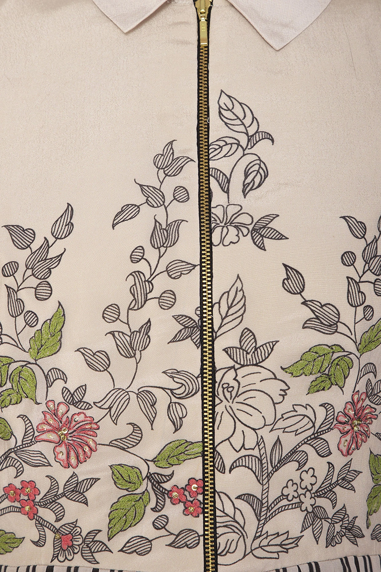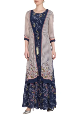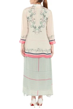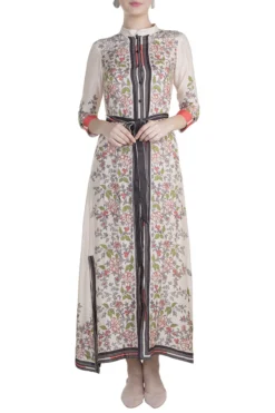 Featuring an off white semi formal high neck maxi dress in crepe base with flared bottom, embroidery and color blocking floral and stripes print.