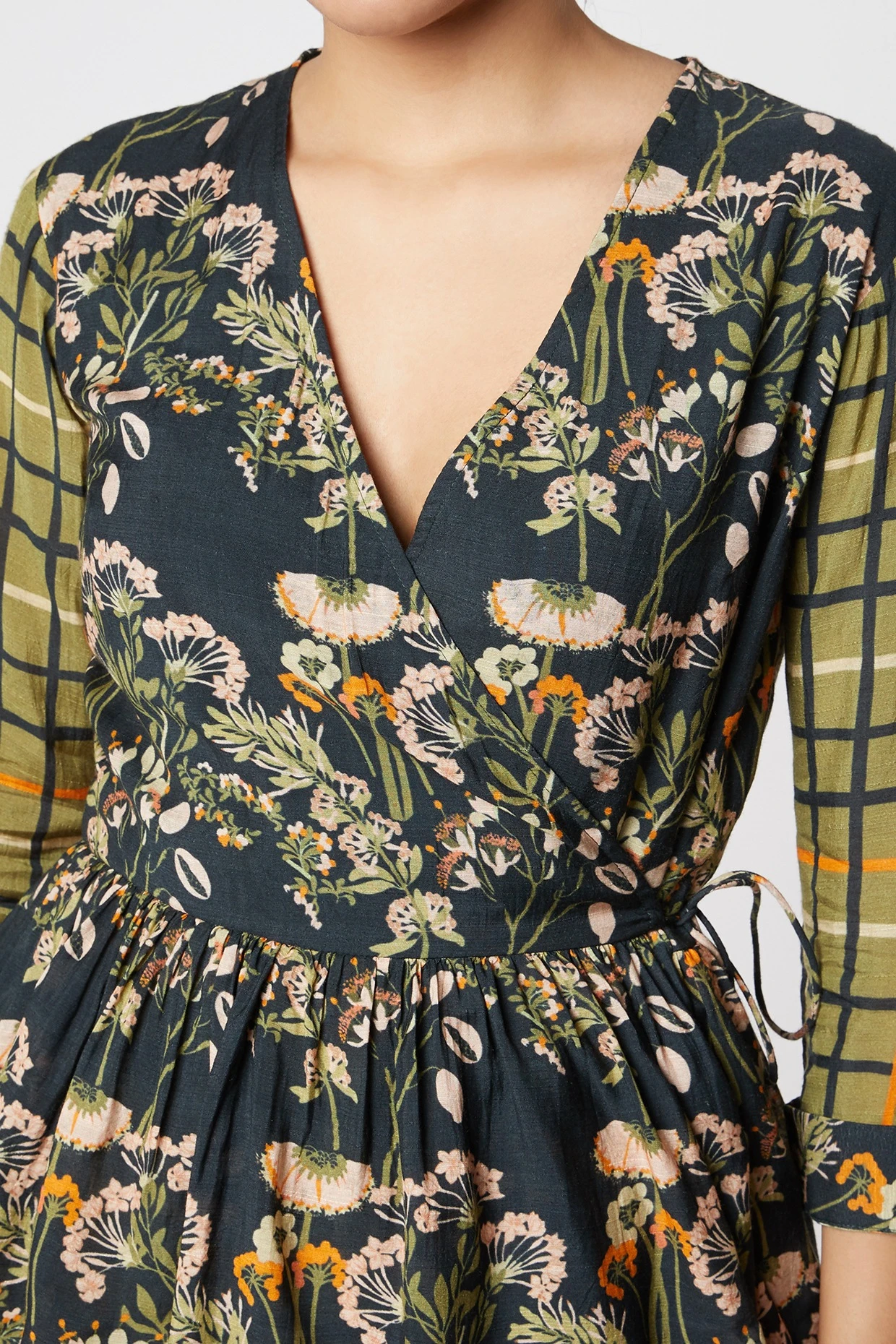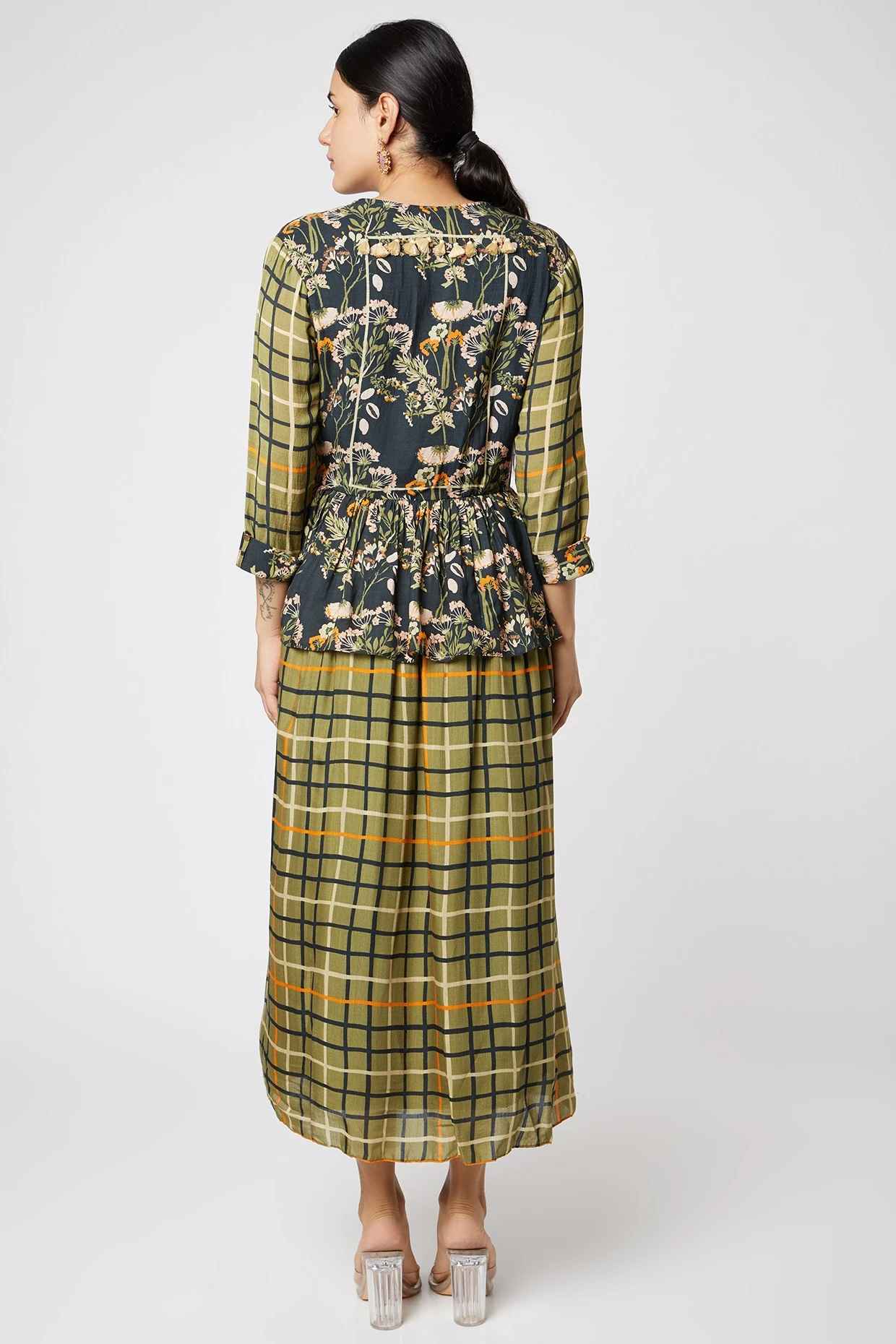 Featuring an olive green dress in muslin slub base with digital print. It is paired with a matching attached jacket.
