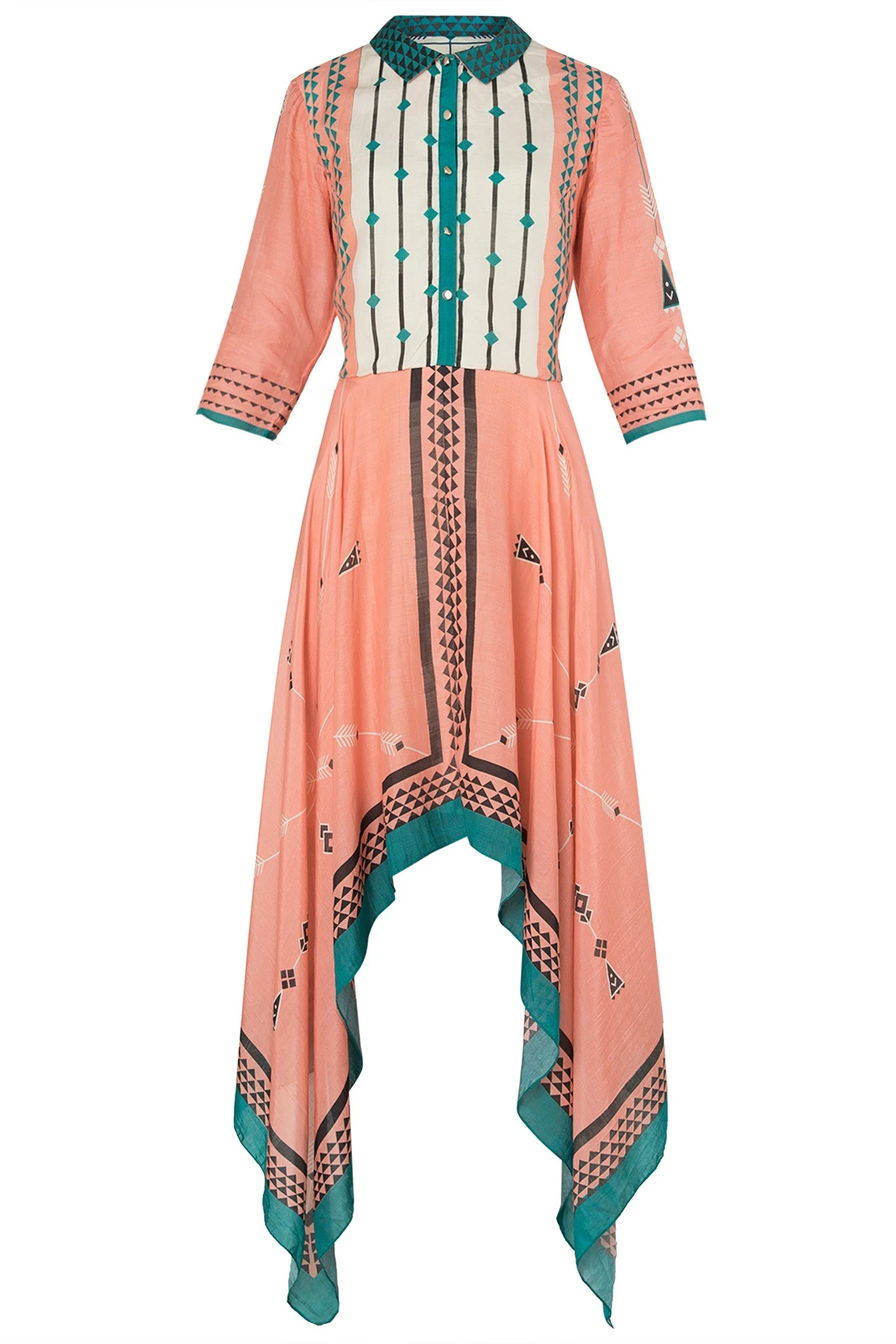 Featuring a peach and green asymmetrical dress in chanderi base enhanced with print all over.