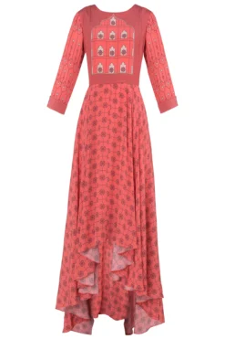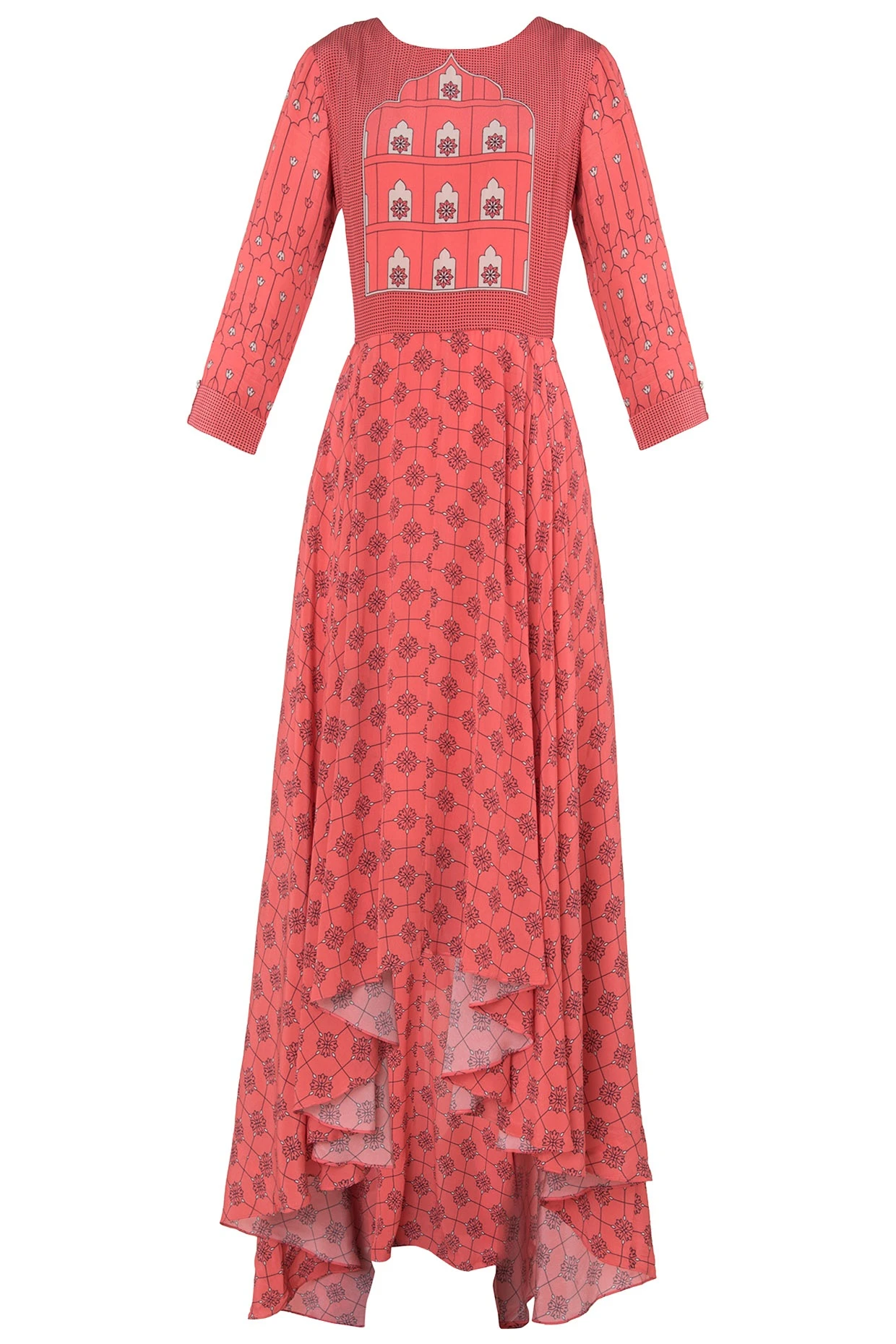 Featuring a peach asymmetrical printed maxi dress in satin blend base.