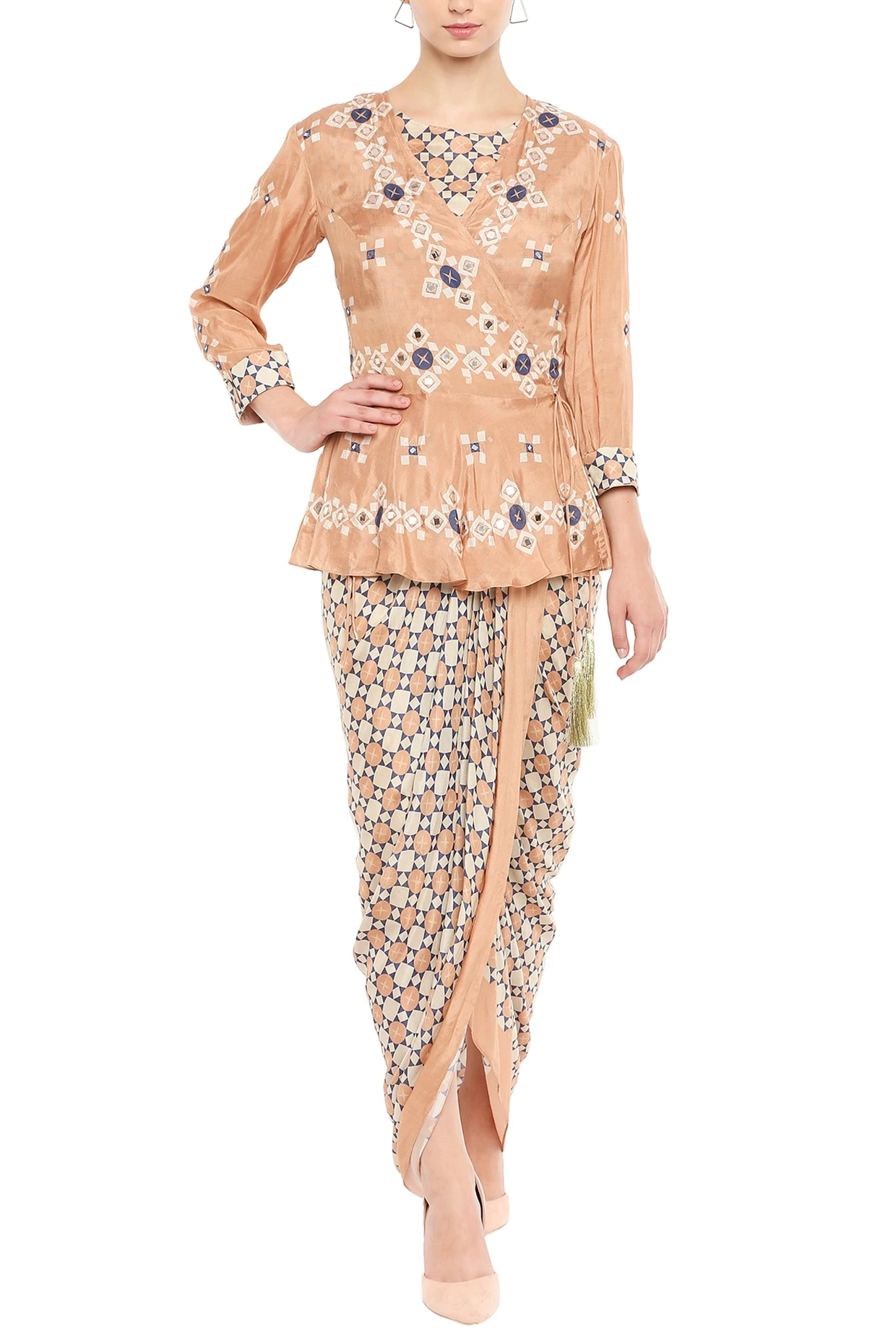Featuring a peach draped dress in cotton base. It is paired with a matching peplum jacket having mirror embellishments and tassels.